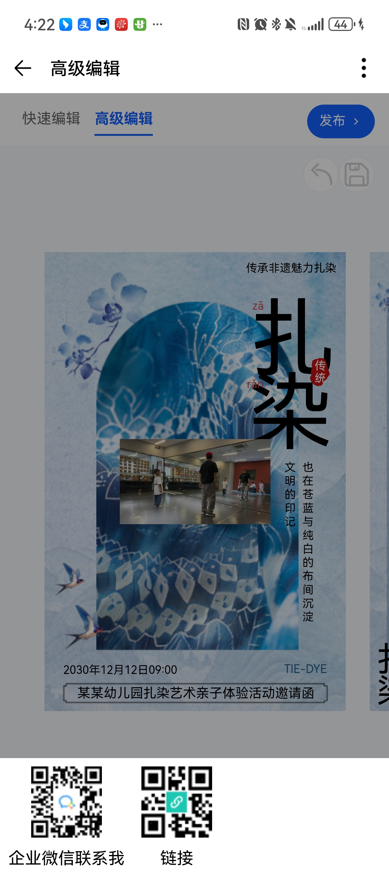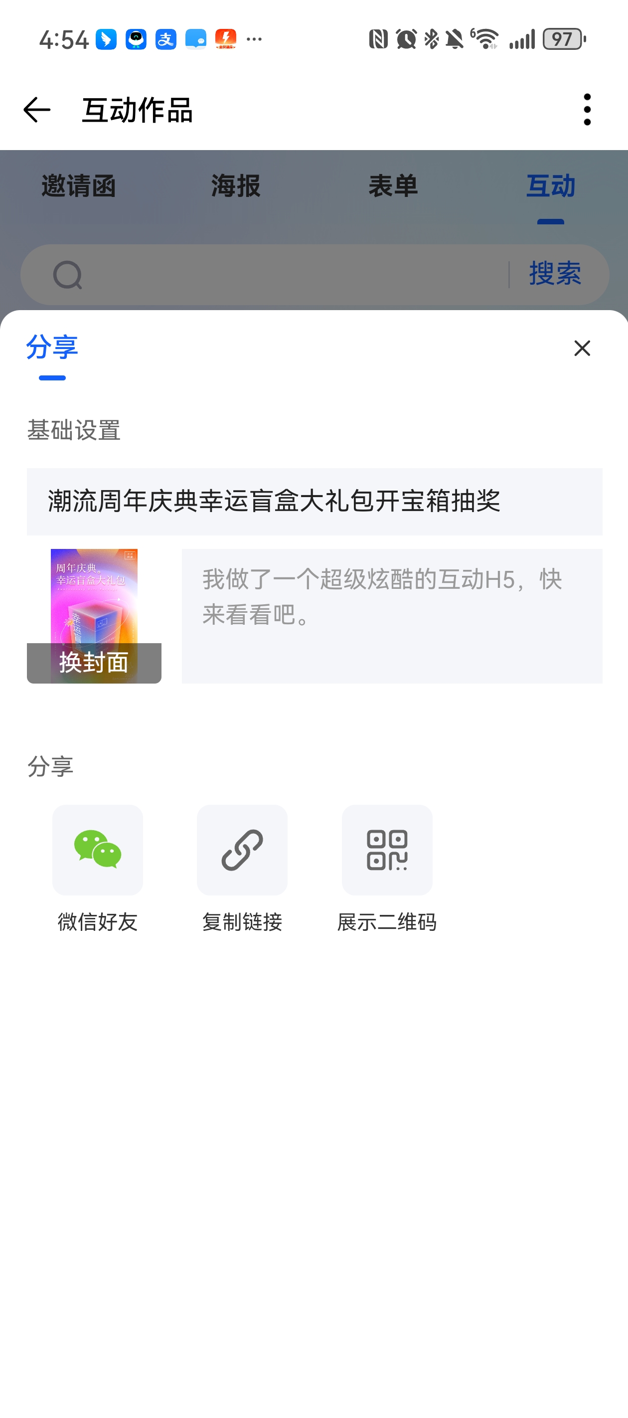 1.2、设置完成之后,点击右上角发布,会发布到我的作品列表中,支持点击编辑,进入编辑器中修改作品,支持点击分享,分享至微信好友,复制链接分享和保存二维码分享