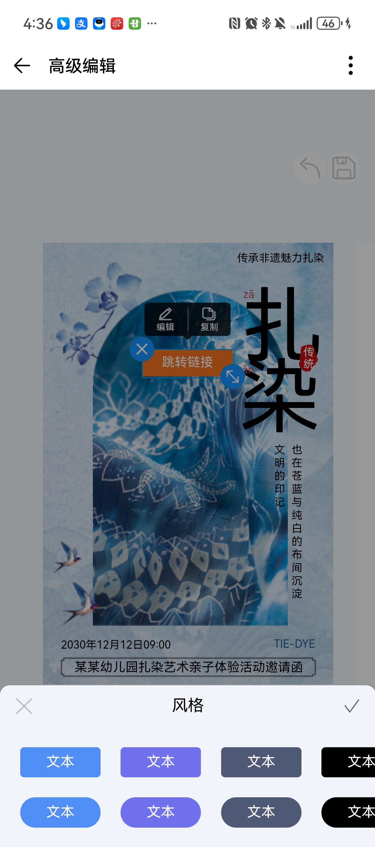 2.9、点击添加链接,画布中出现跳转链接的按钮,支持编辑跳转按钮和链接地址,支持修改按钮风格,支持添加按钮动画;