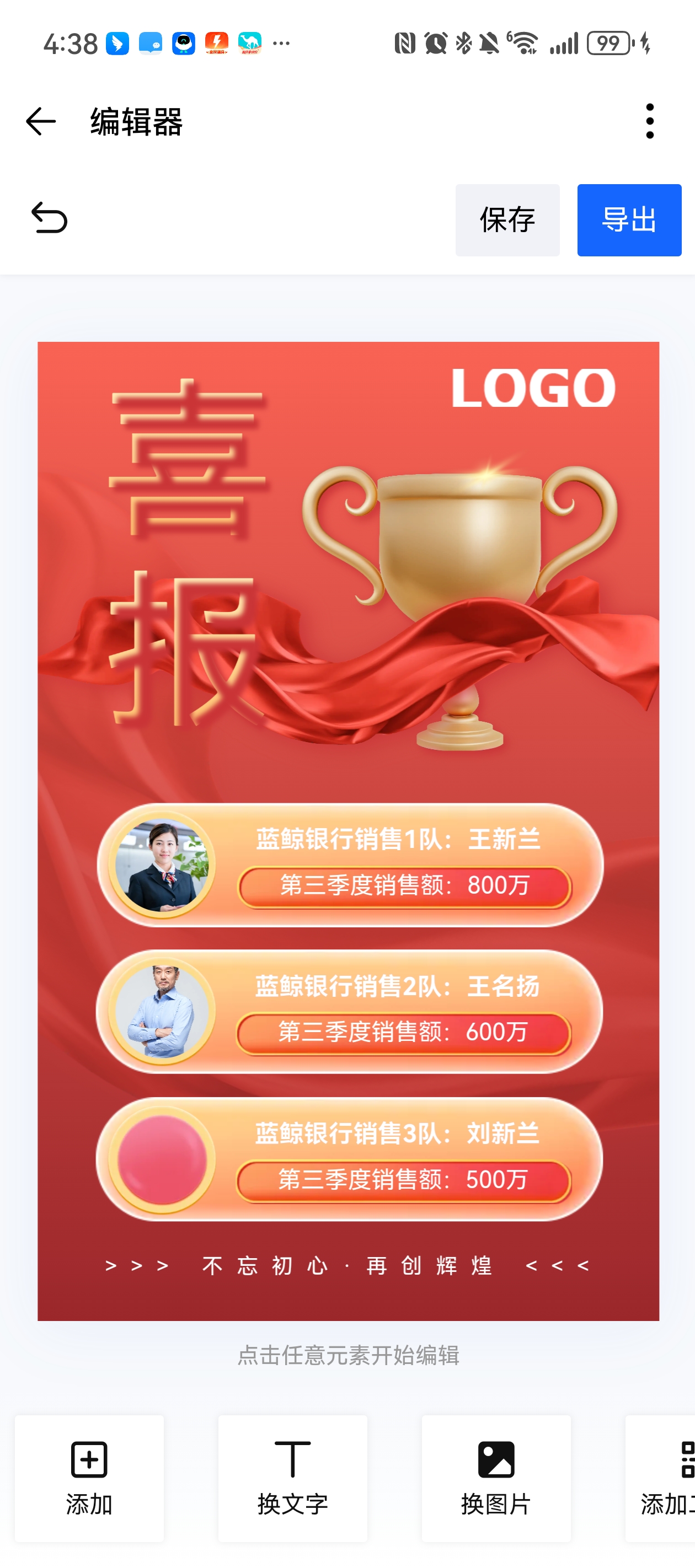 2.5、海报编辑器支持换文字、换图片,是指当前画布中所有的文字和图片会被显示出来,支持直接更换,如下图