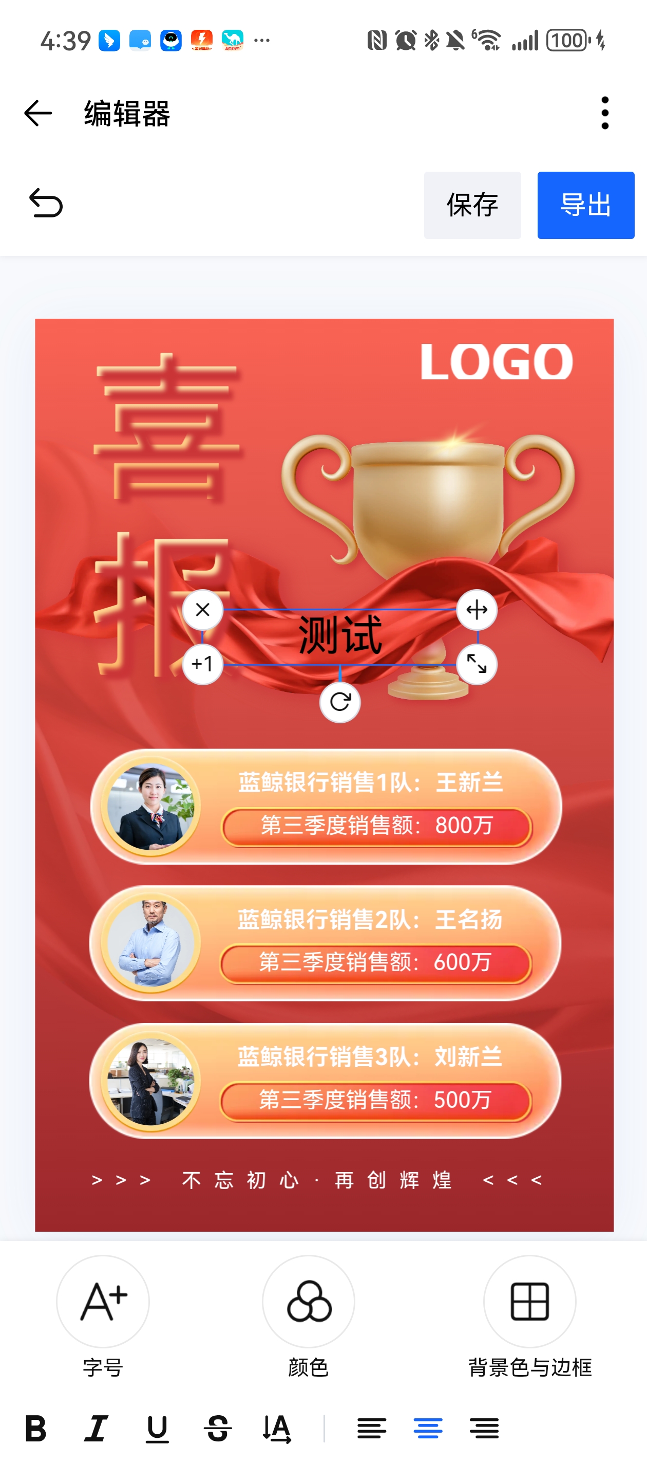 2.9、支持增加艺术字,选择艺术字样式,添加之后,支持替换、修改字号、颜色、背景色、背景色和边框,加粗、斜体、下划线、居左、居右居中等;支持拖拽改变位置、拖动改变大小尺寸