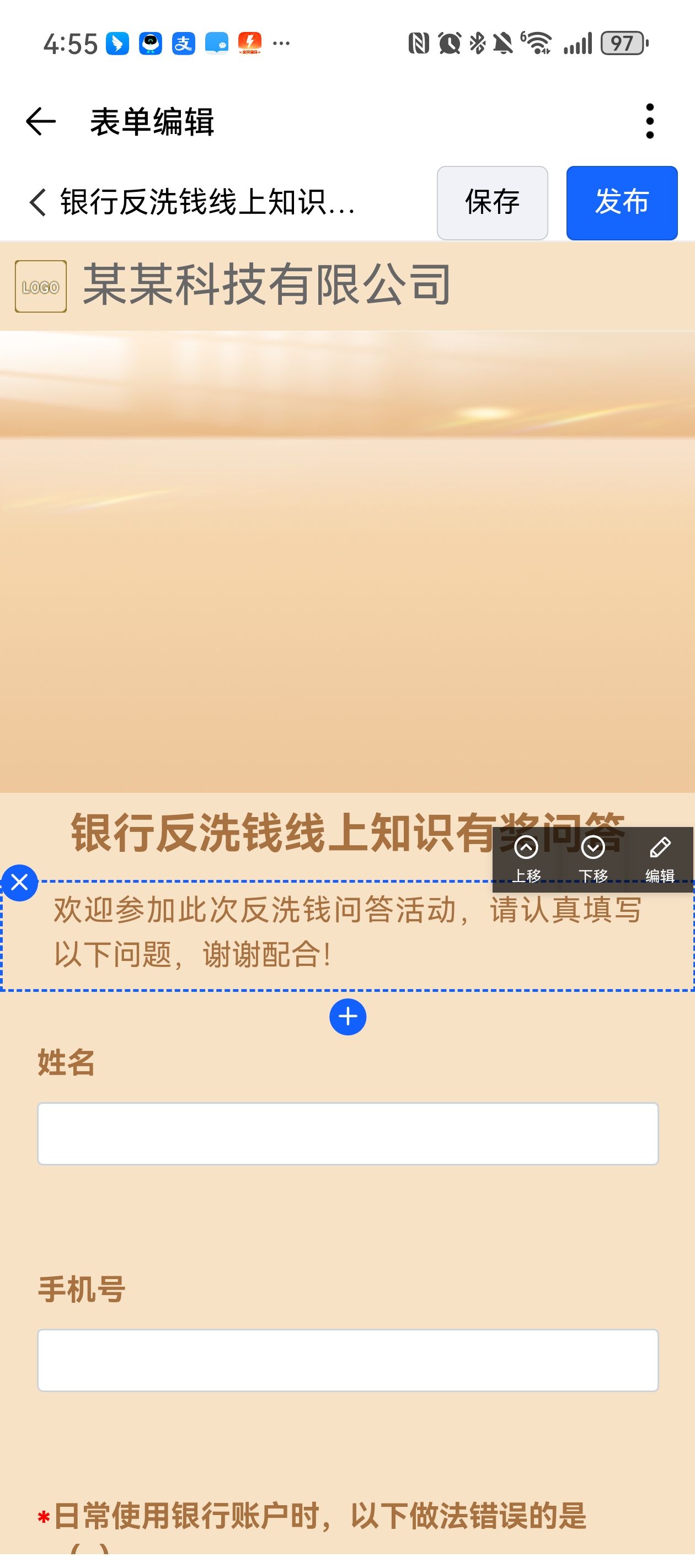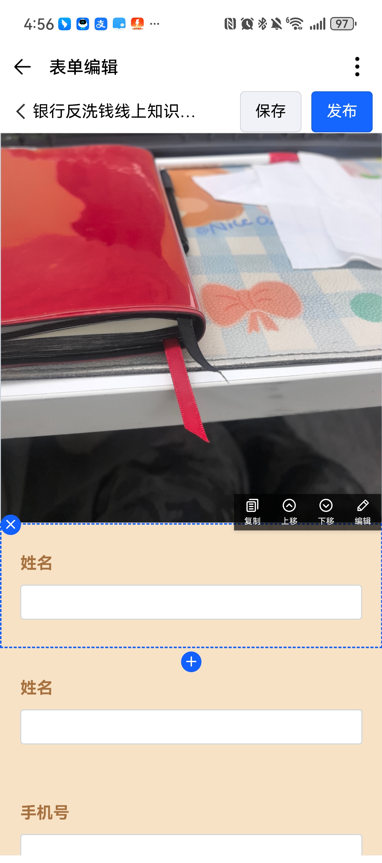 支持添加下拉选择框、单选题、多选题和评分题,每个组件都支持编辑、上下移动位置、复制和删除;
