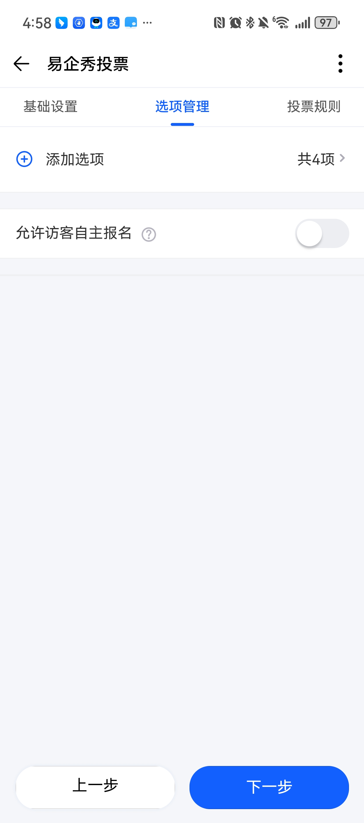 2、投票评选类,点击使用进入编辑器,支持对投票评选作品进行活动标题、活动主图和活动说明的编辑,点击下一步,支持添加投票选项,可以设置是否允许访客自主报名,设置之后点击下一步,设置投票规则;设置完成之后,点击发布投票