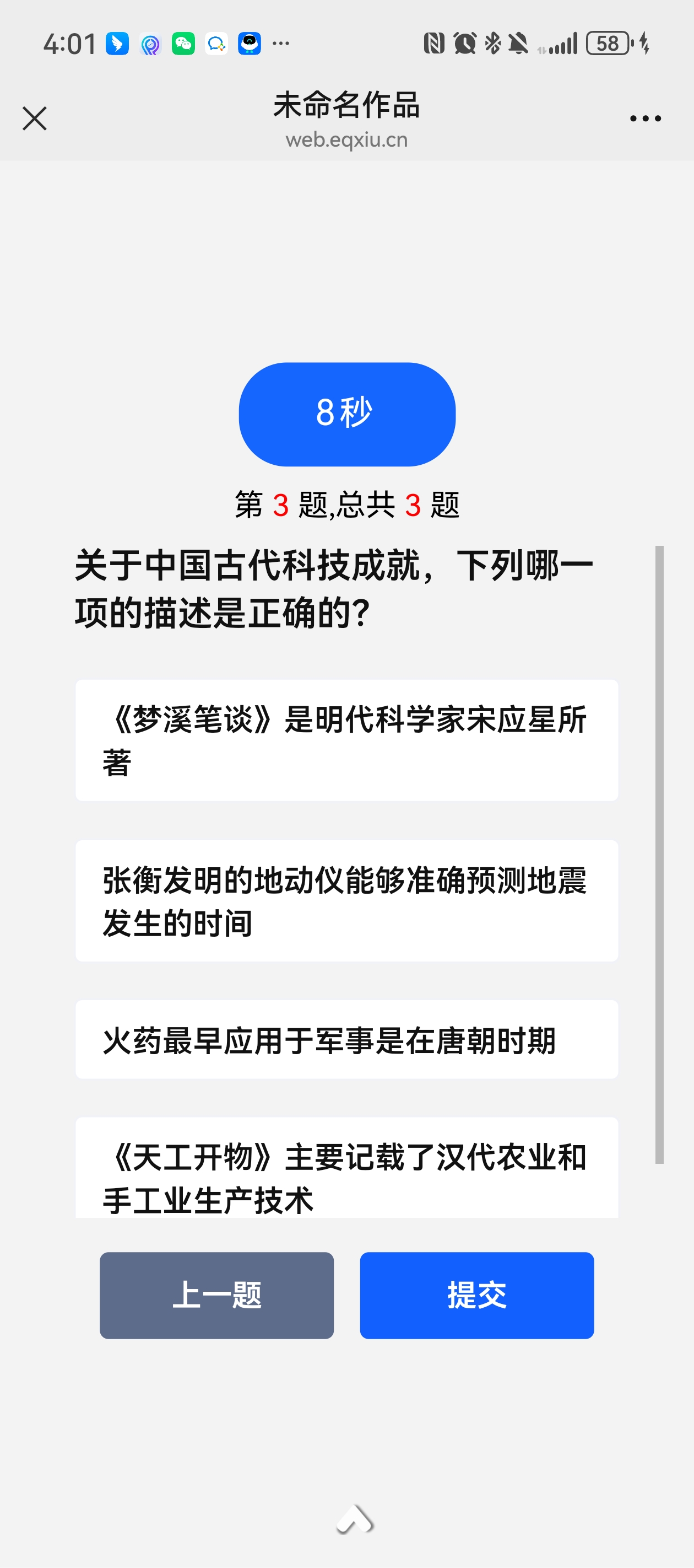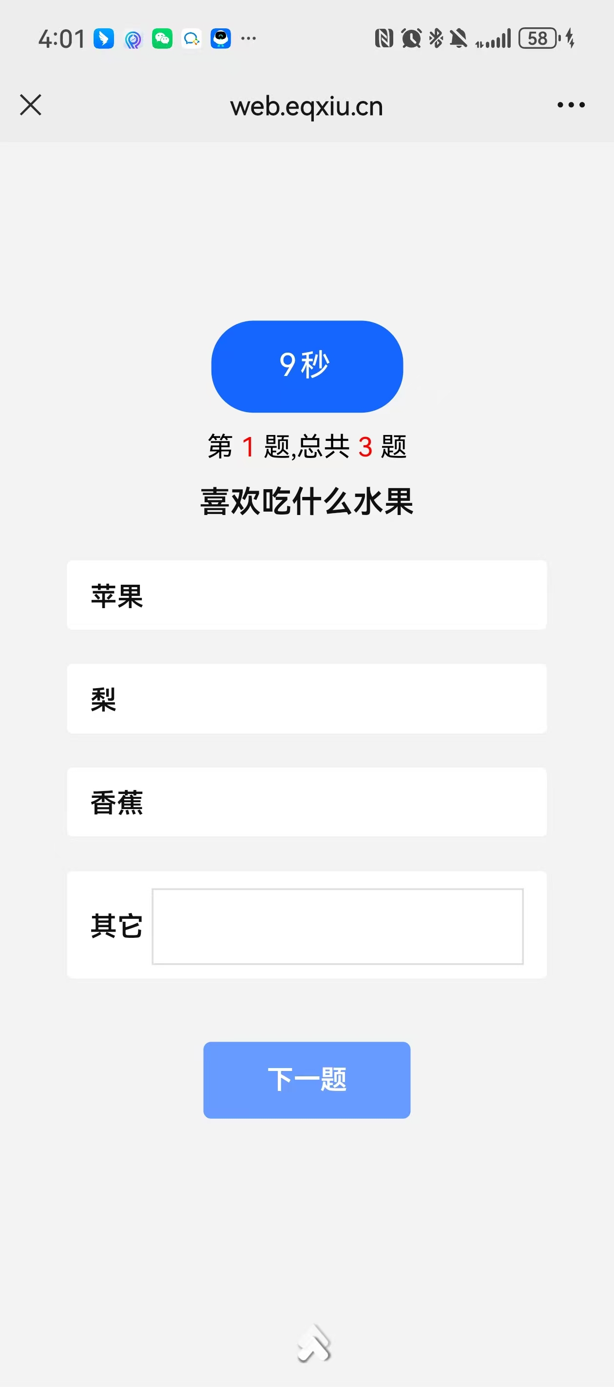 第一天选了其他,输入其他输入框的内容,点击下一题,直接跳转至了设置的第三题,选择之后,点击提交,提交答案。
