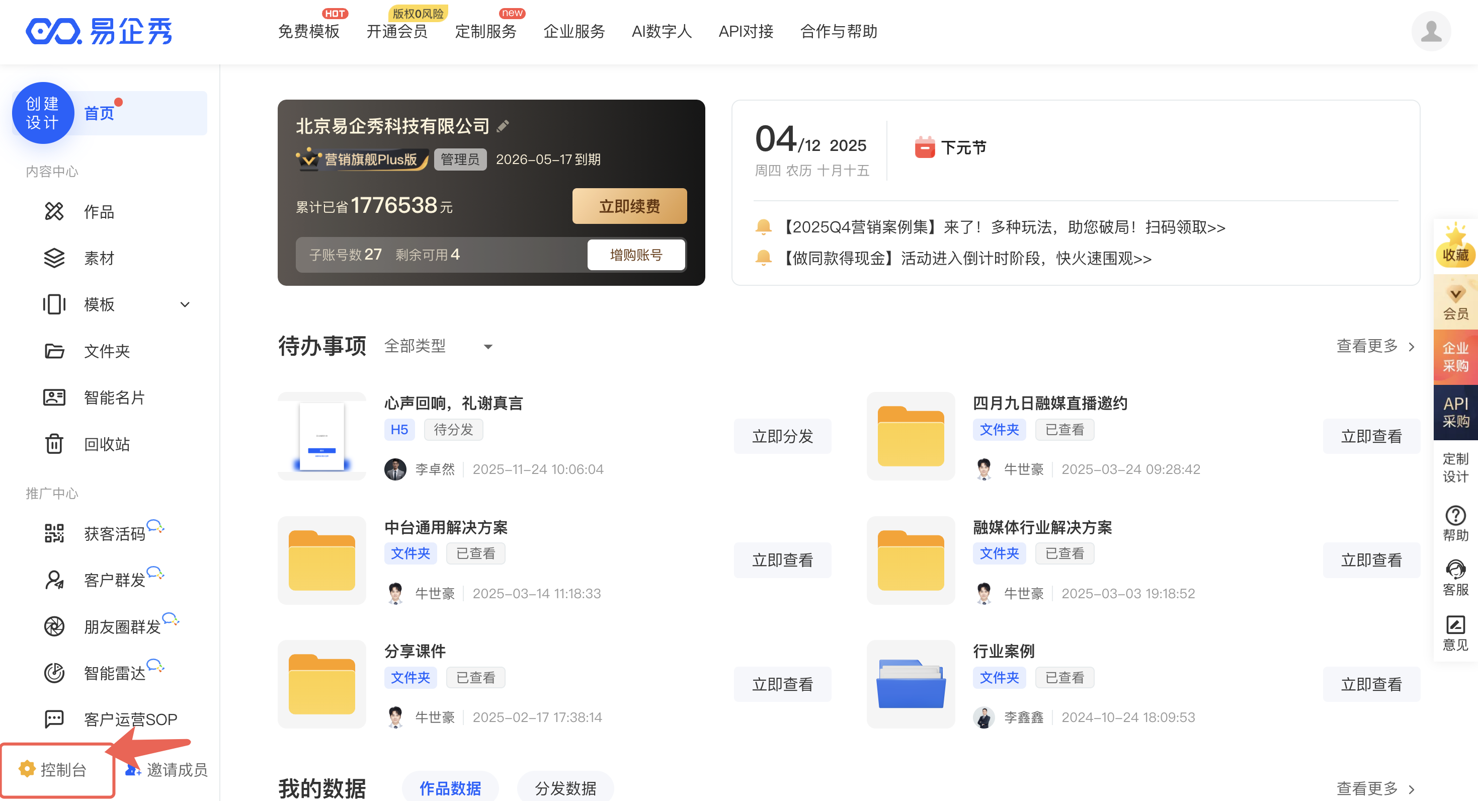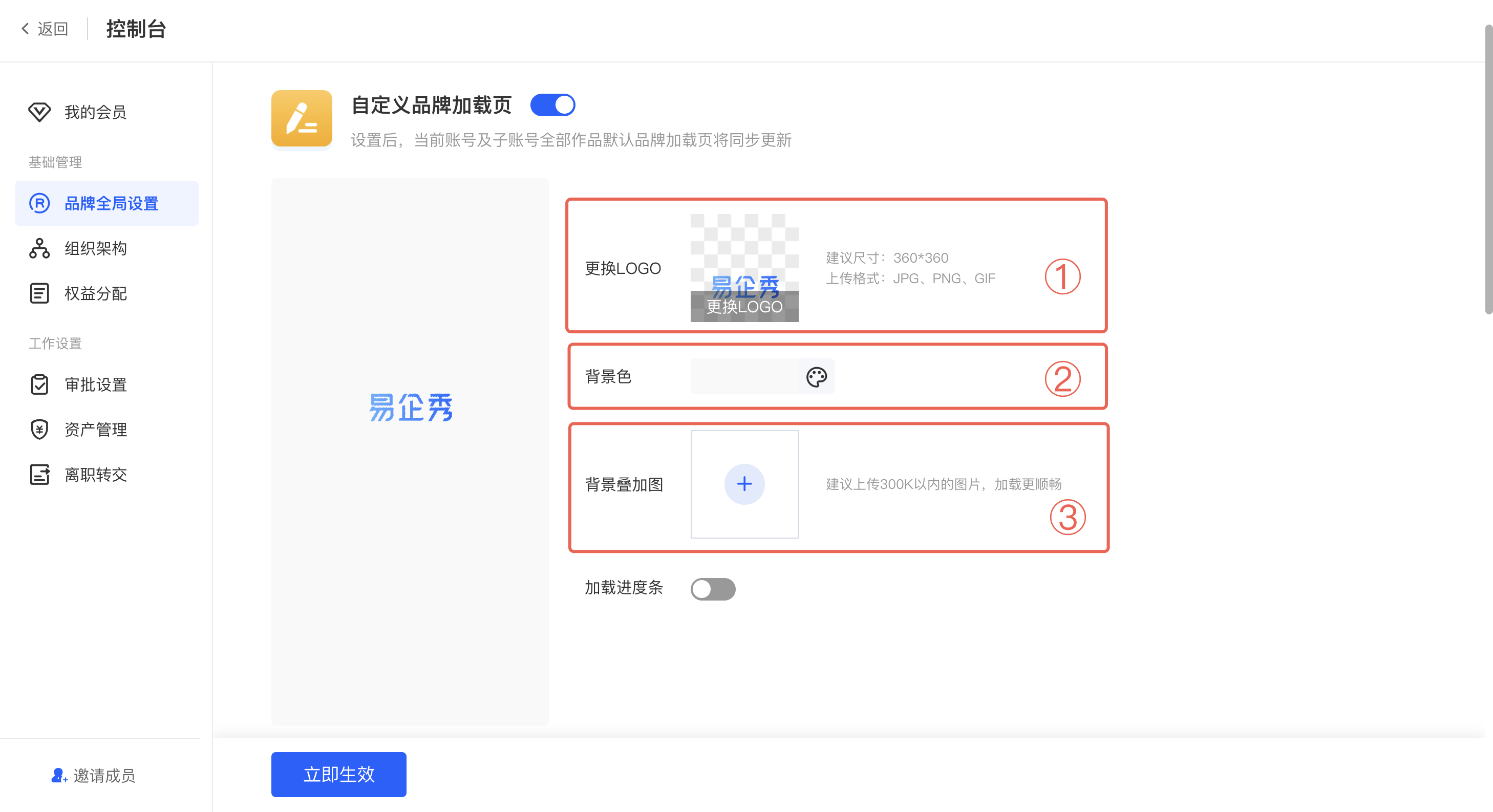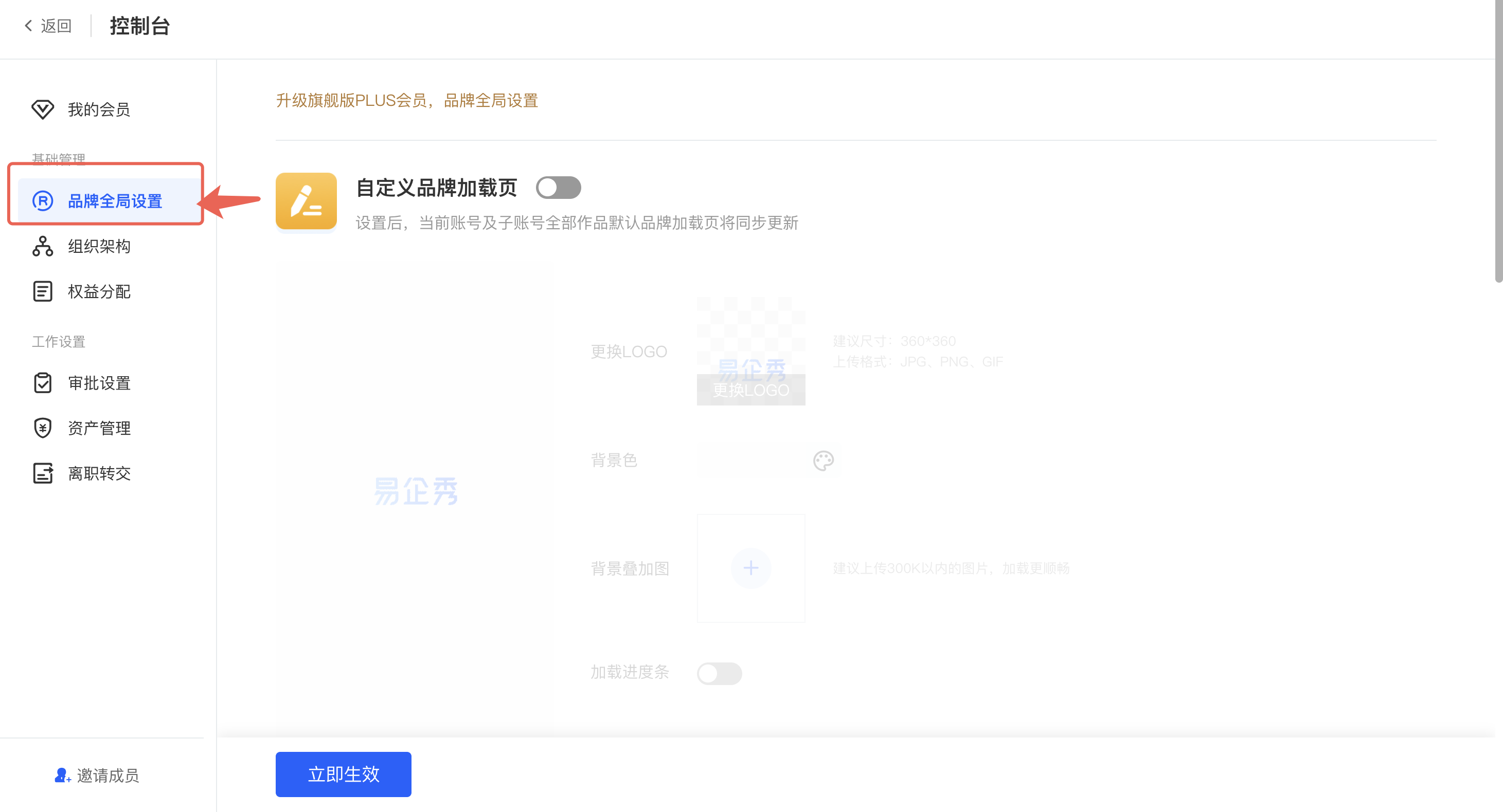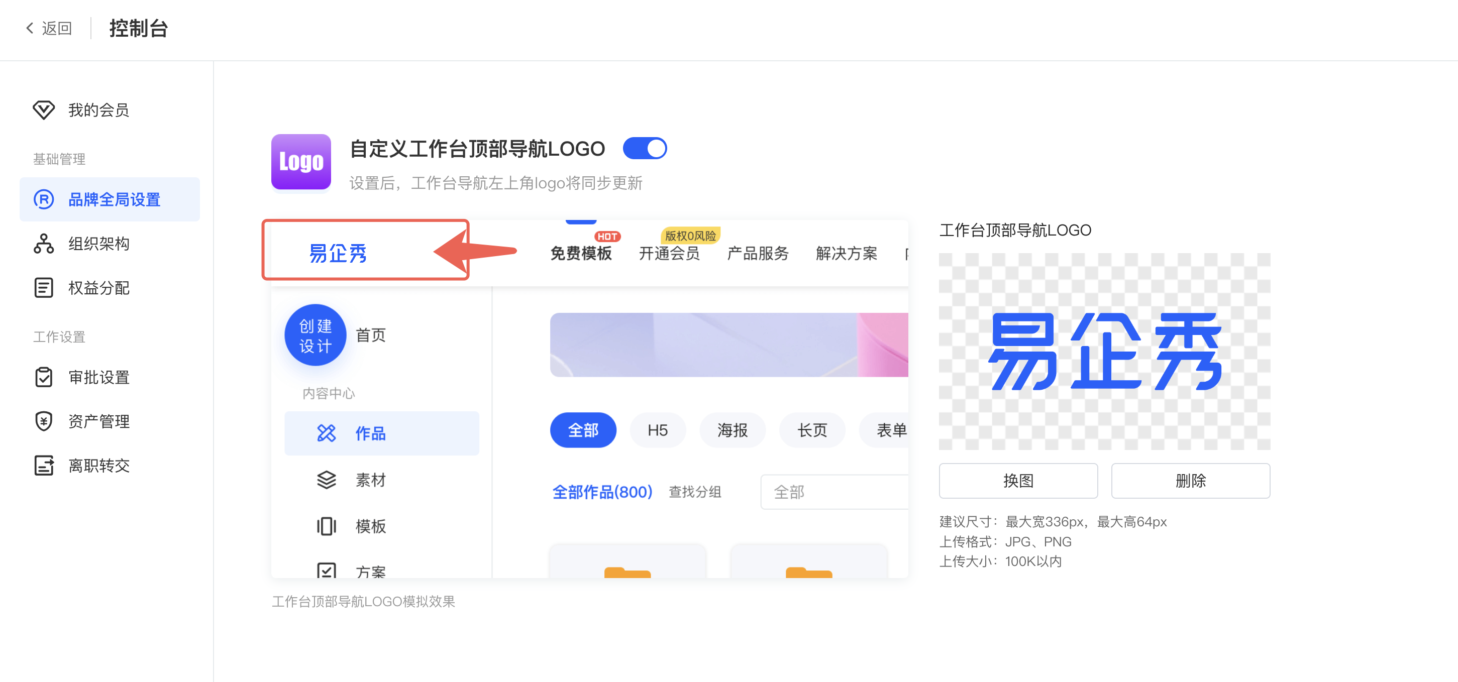 设置成功后,企业名下所有成员登录易企秀账号工作台后,左上角logo显示为企业自有品牌