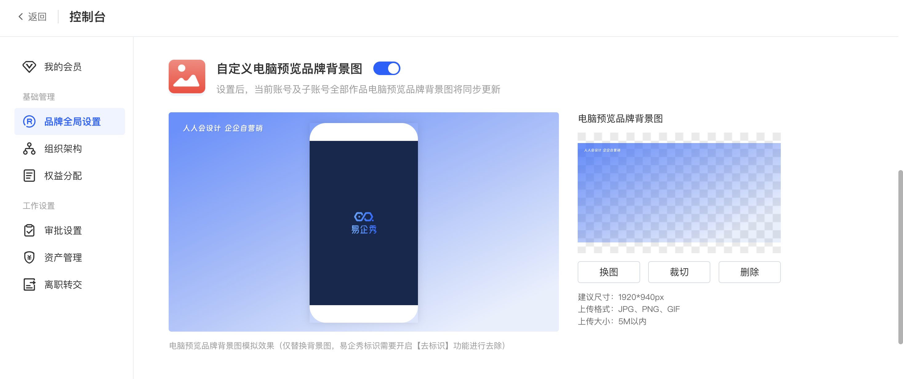 网页类作品在电脑端打开时,会露出通用电脑预览背景图,企业可以设置专属品牌视觉背景图,按尺寸上传后生效