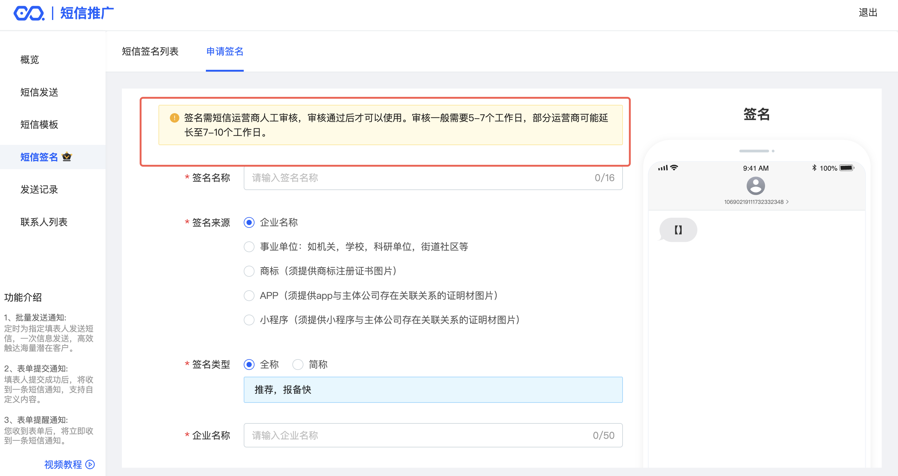 注意:签名需短信运营商人工审核,审核通过后才可以使用。审核一般需要5-7个工作日,部分运营商可能延长至7-10个工作日。如有重大活动需用到自定义短信签名,请提前至少10个工作日发起审批申请;