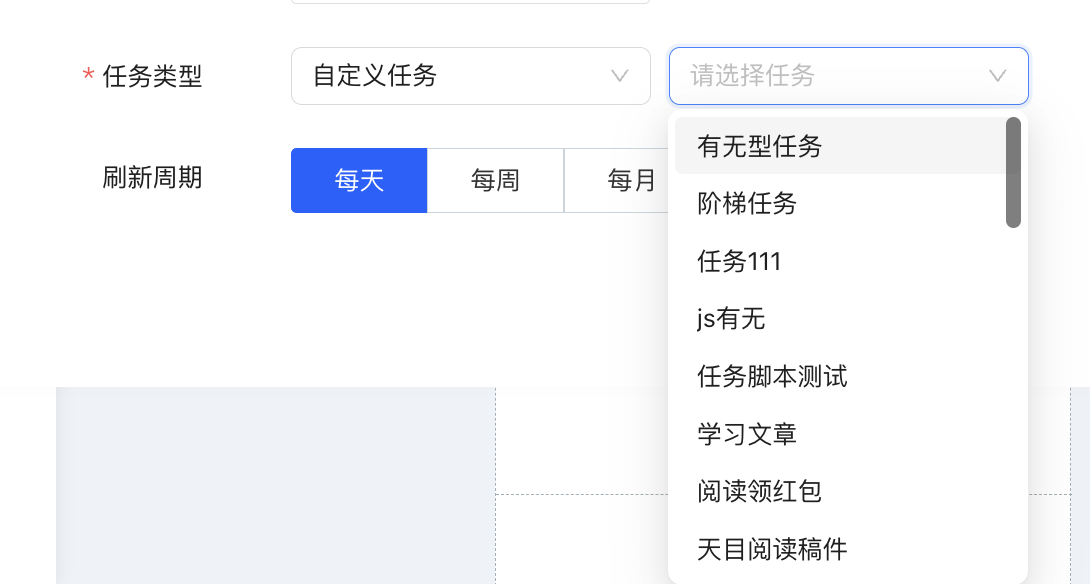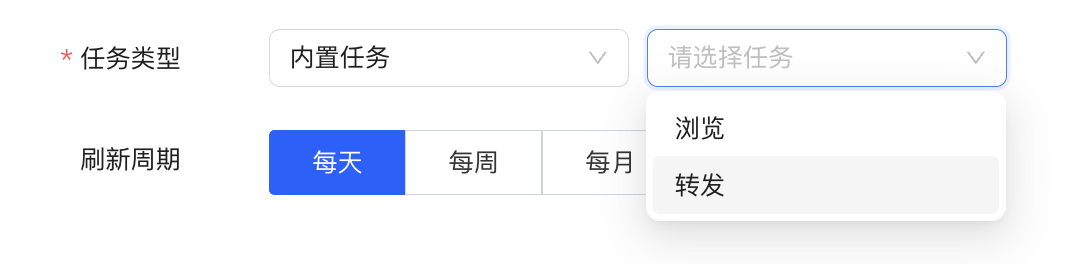 设置任务内容,任务描述,任务活动时间,选择任务类型,我们目前提供内置的任务为转发和浏览,可切换选择自定义任务,自定义任务就是在任务库中配置的任务
