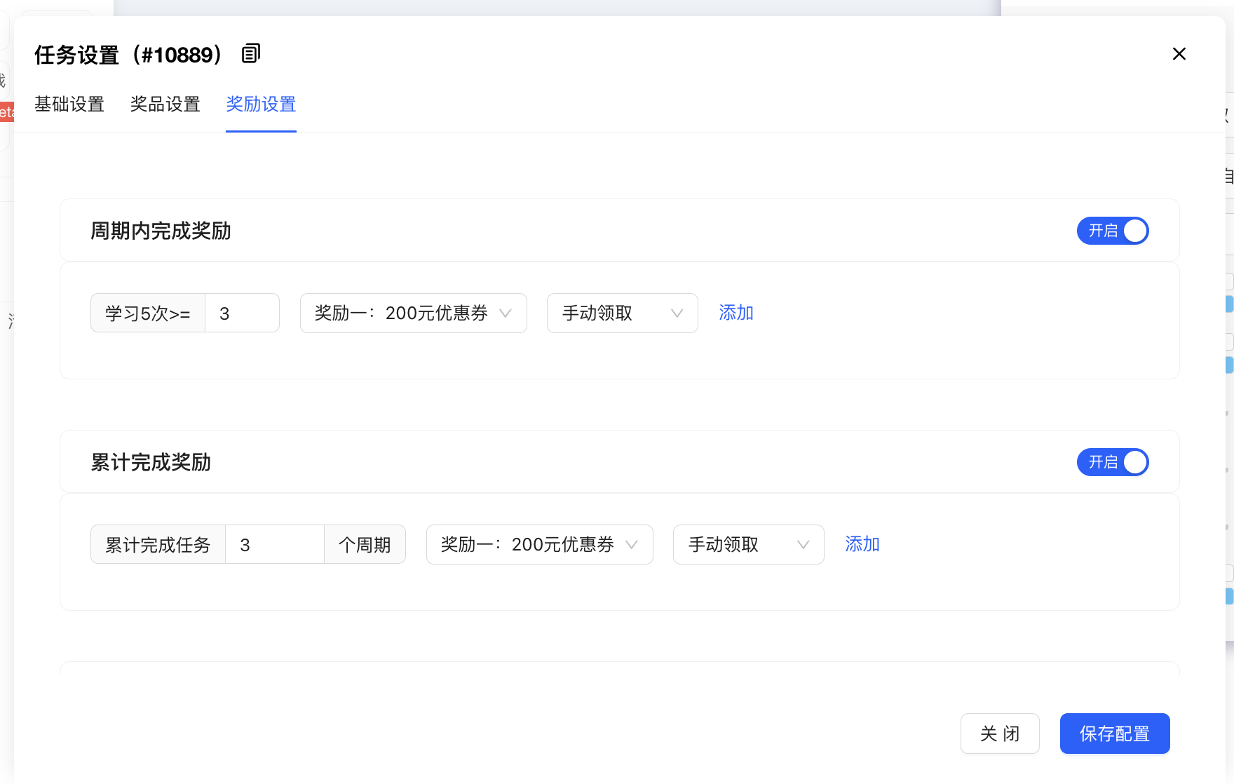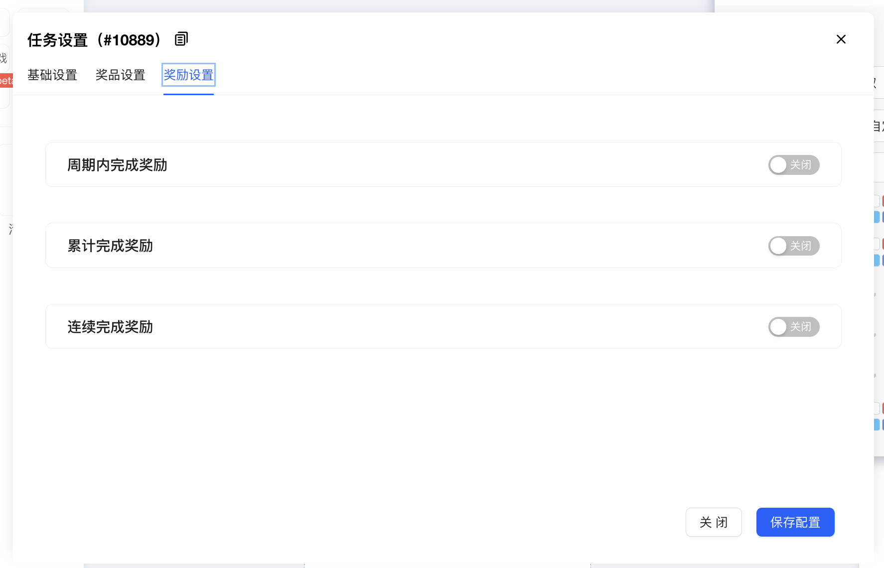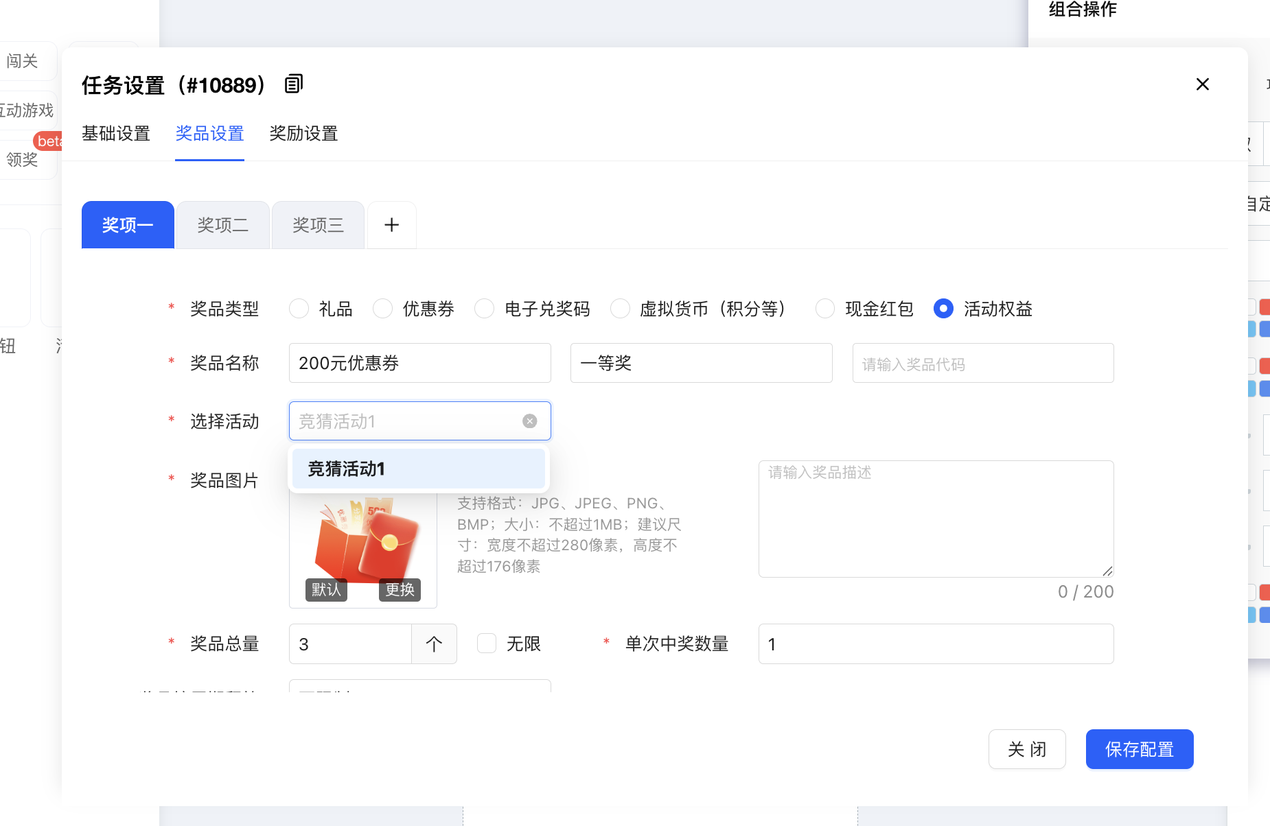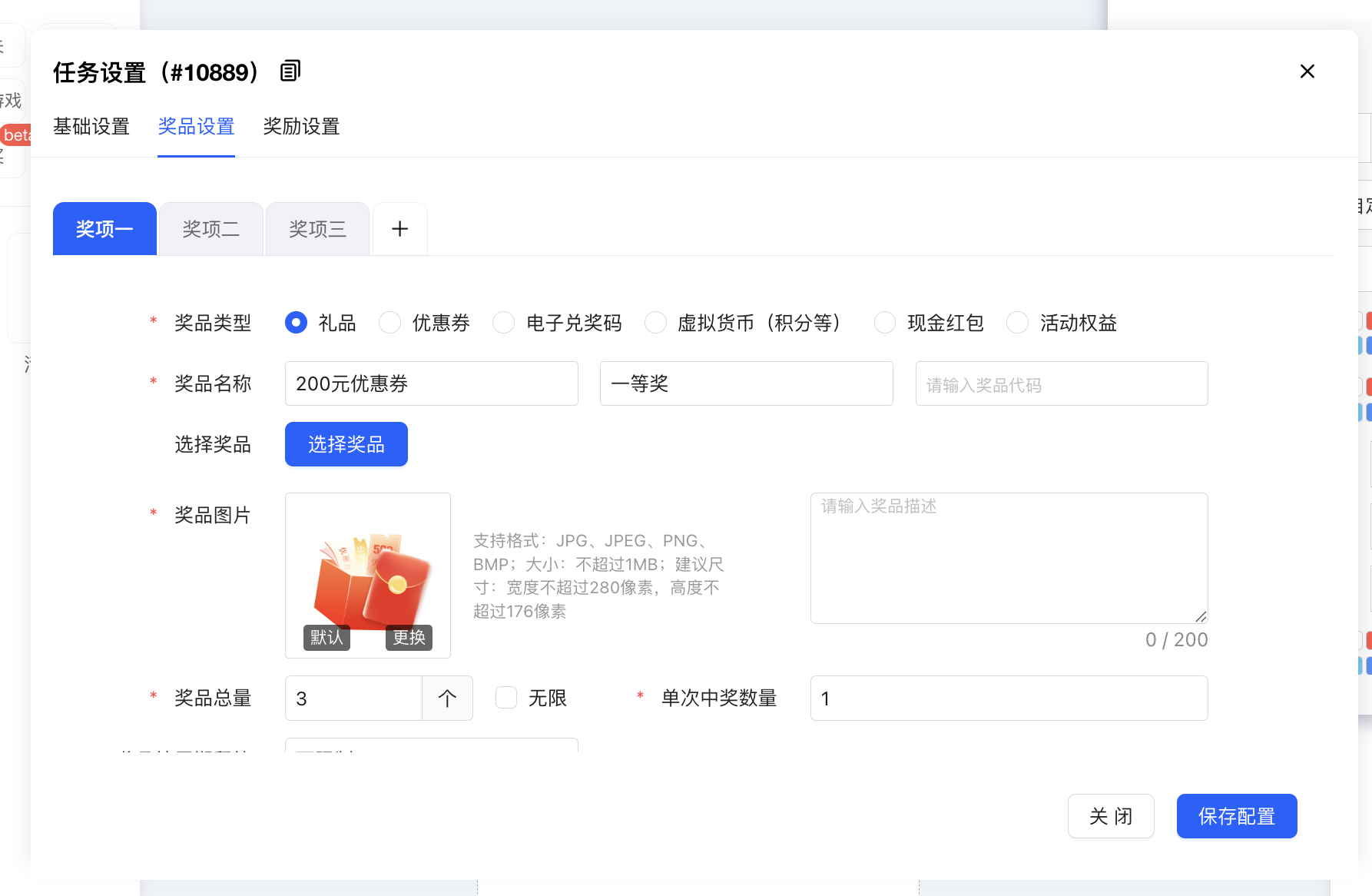 奖品设置:可以选择完成这个任务获得的奖品进行配置,支持礼品和活动权益