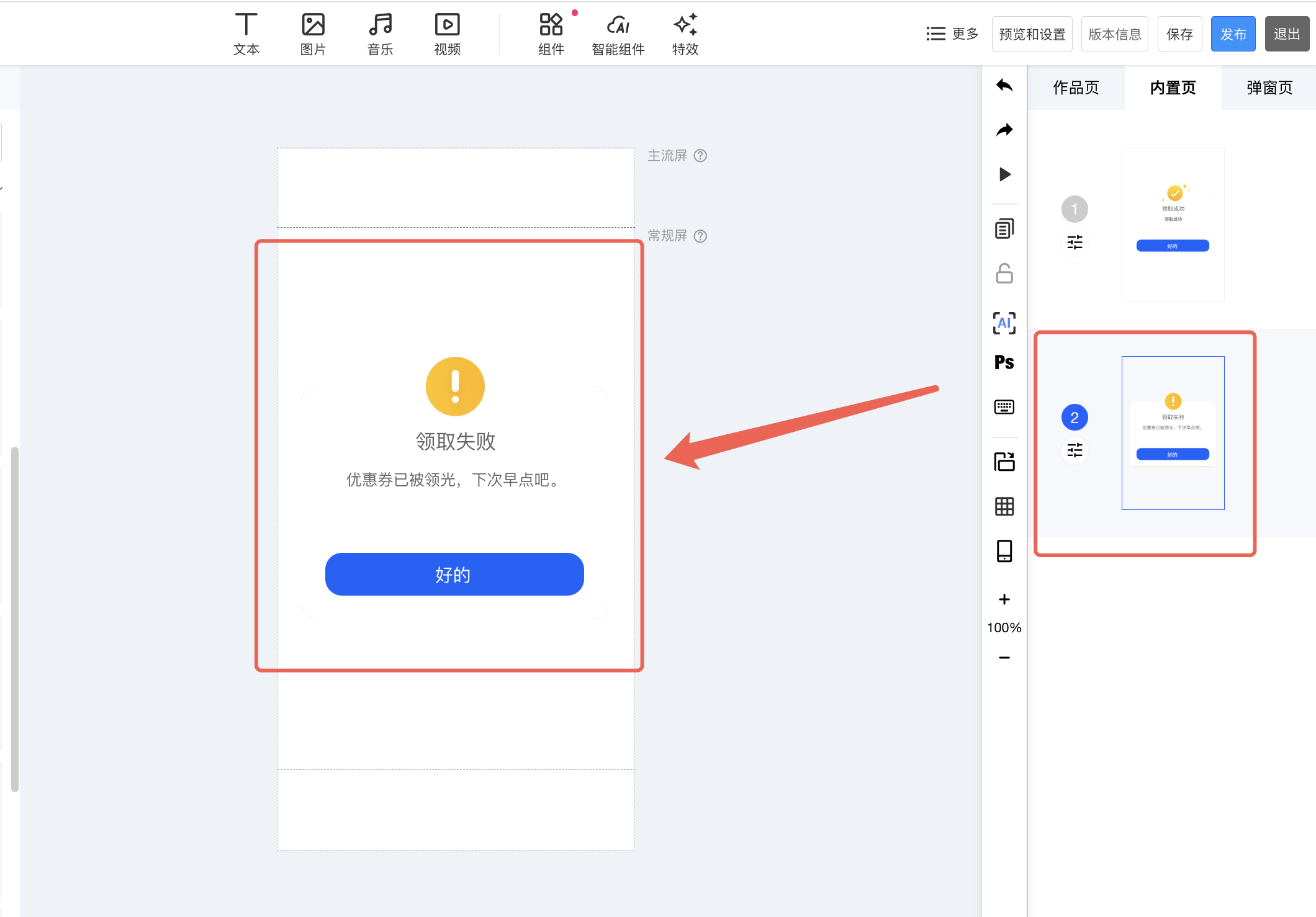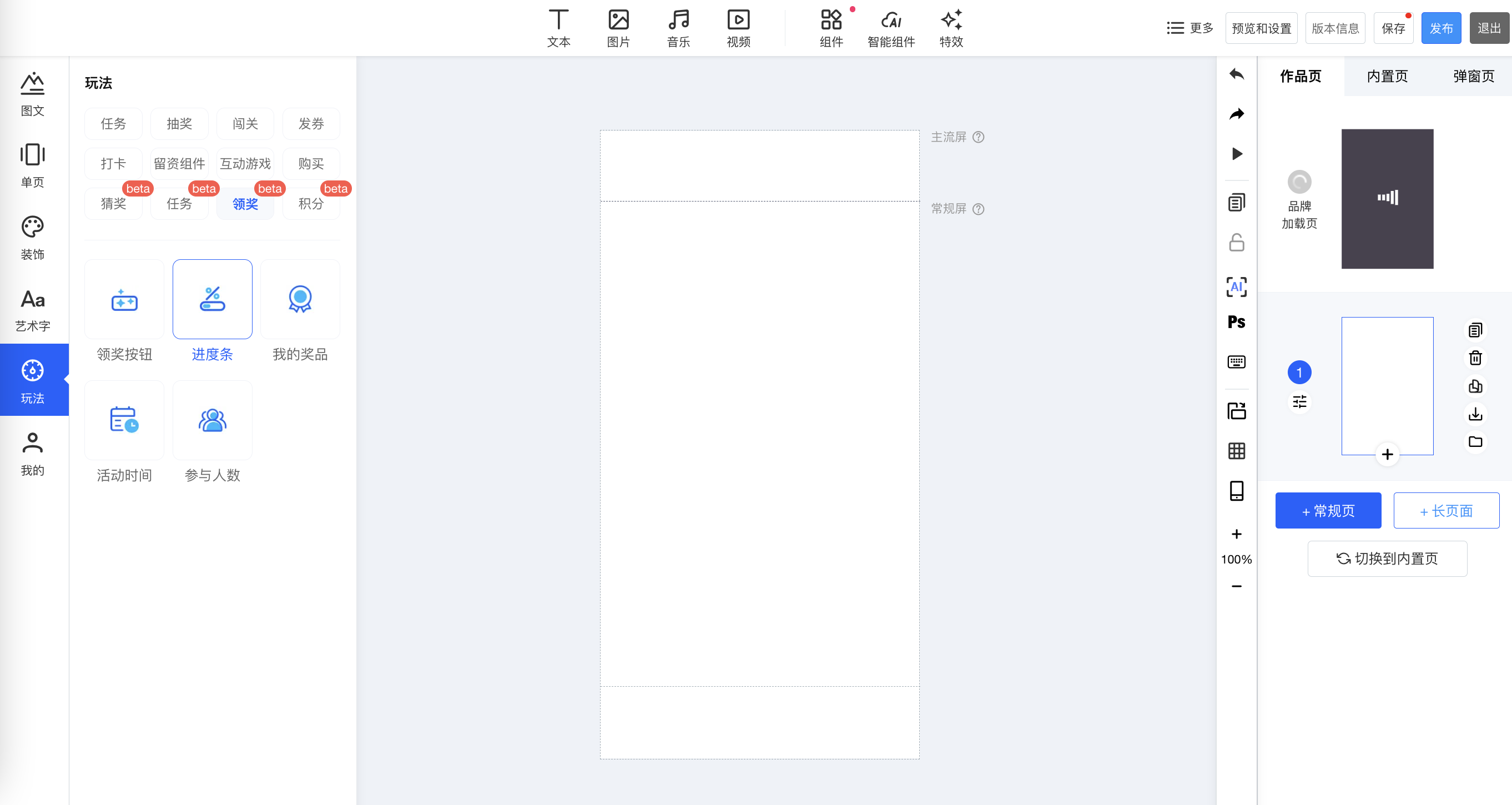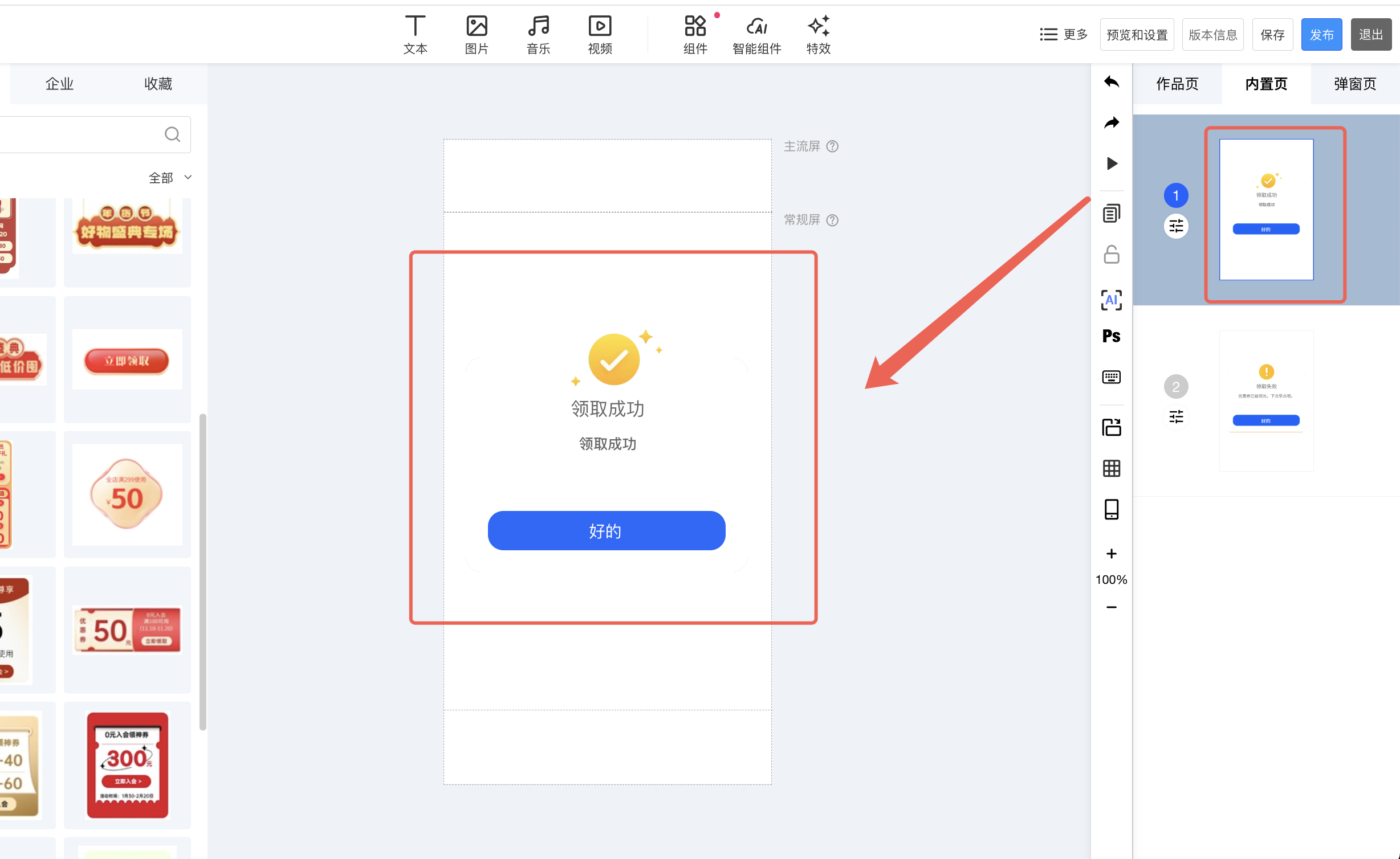 点击玩法-领奖,出现领奖的各个组件,点击添加领奖按钮,出现在画布中