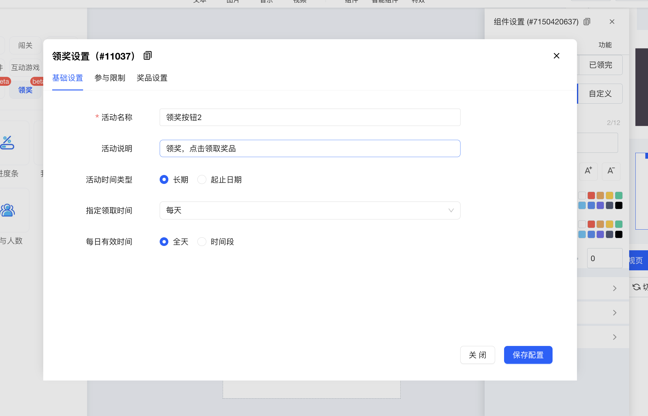 点击组件的配置按钮,出现领奖设置弹框,基础设置中设置活动名称、活动说明、活动时间类型、指定领取时间和每日有效时间