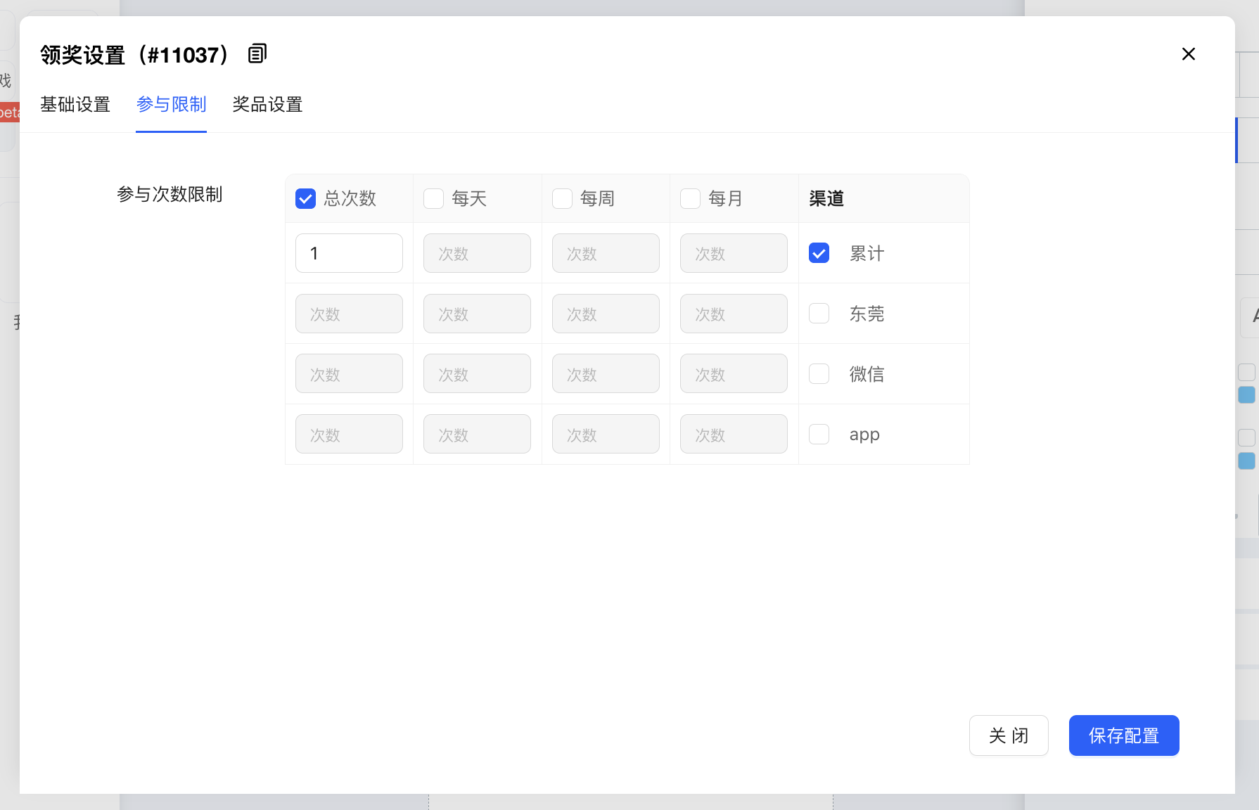 点击参与摄制,可以设置领奖按钮的参与次数现在,各个渠道中每日/每周/每月的总次数