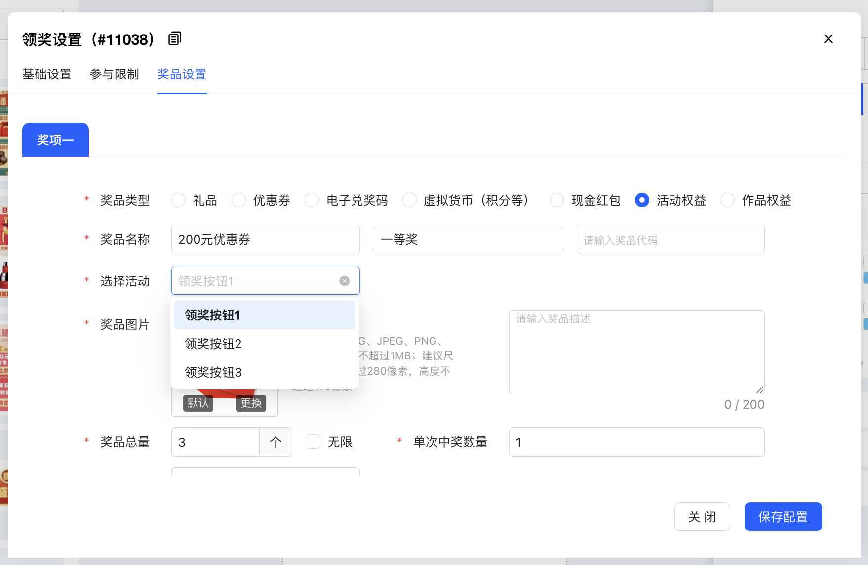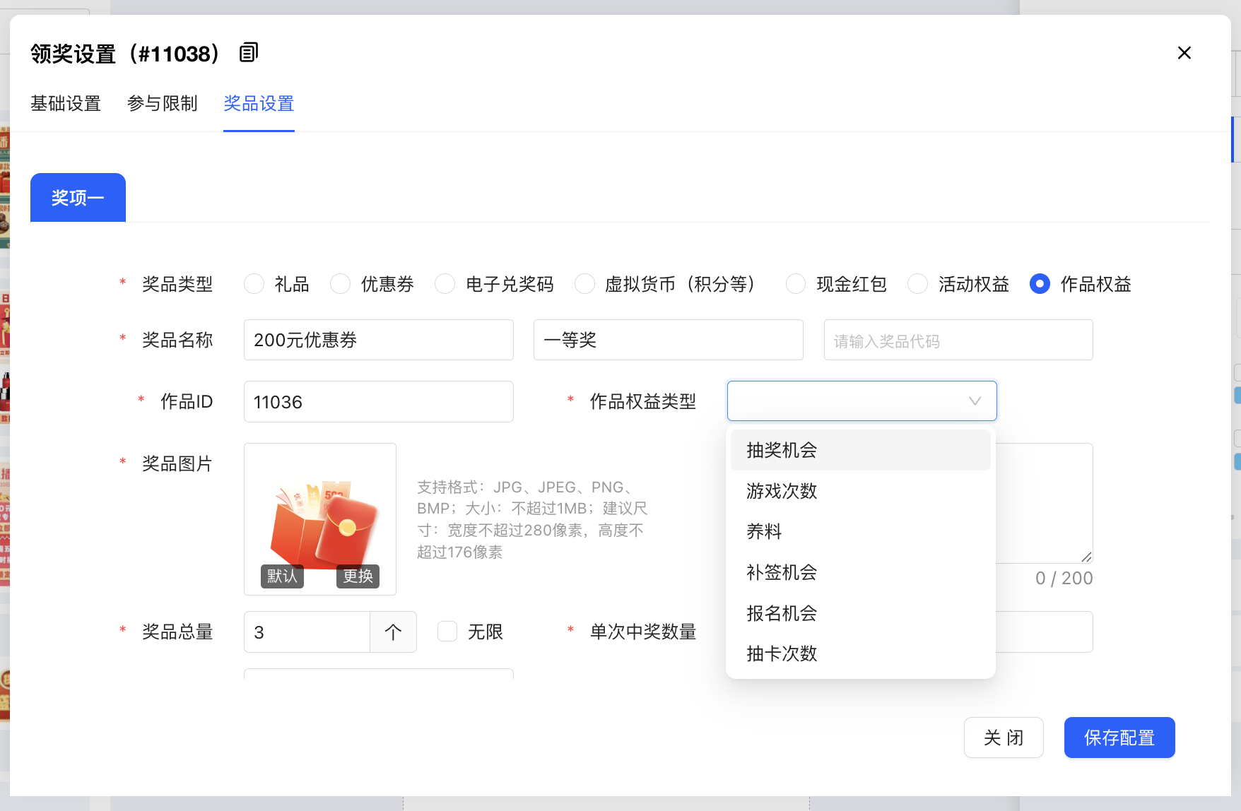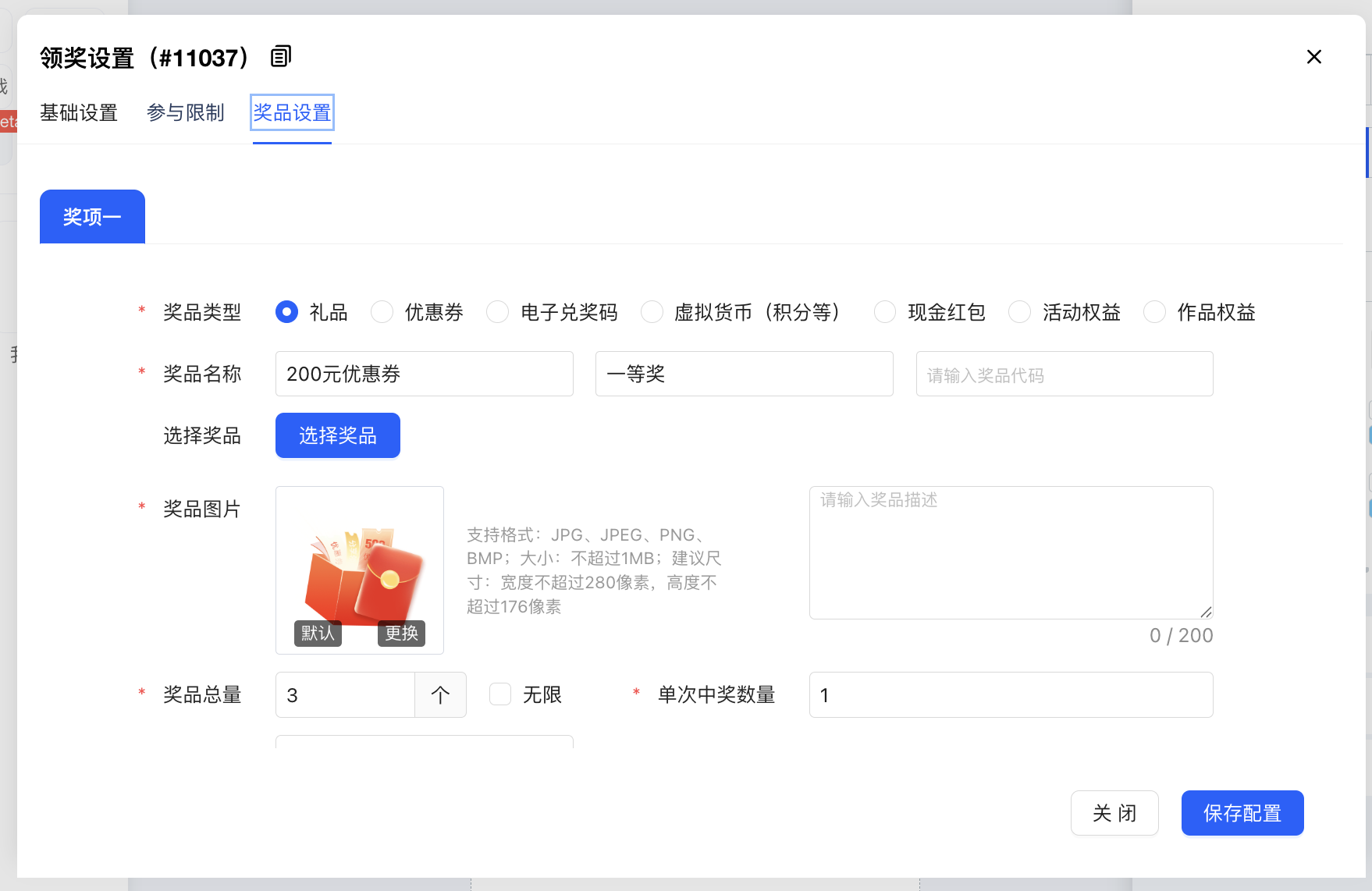 奖品设置中,可以设置点击领取按钮获得的奖品,支持礼品、优惠券、电子兑奖码、虚拟货币,现金红包、获得权益和作品权益;