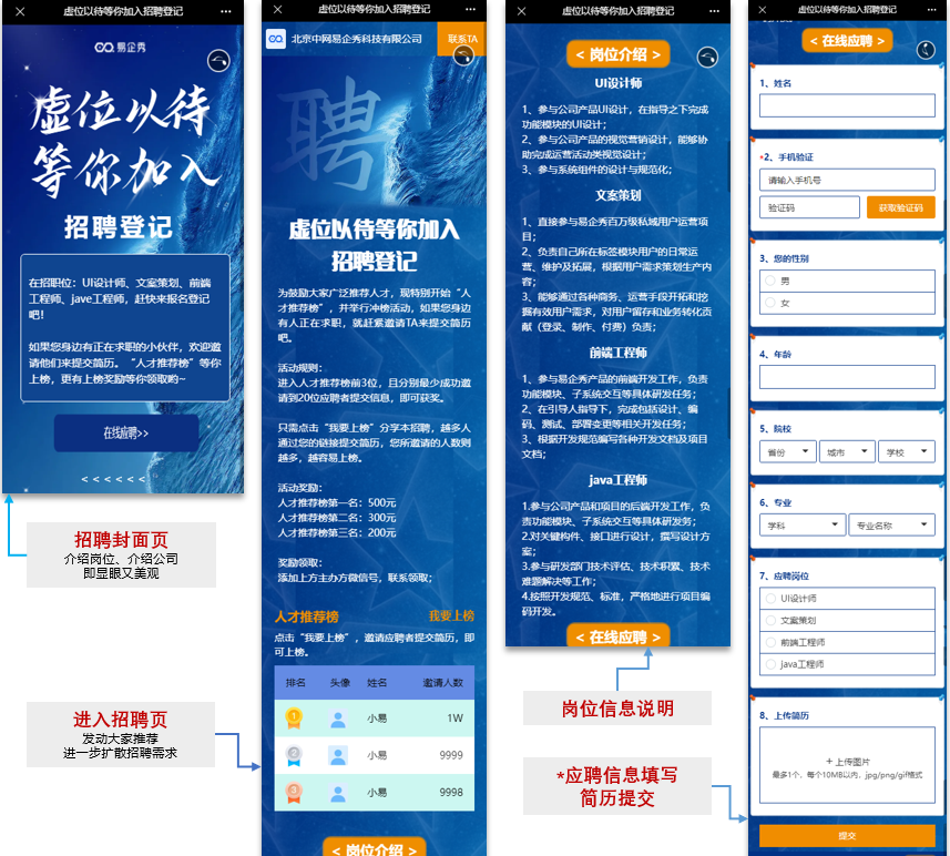 如上图示例,可以看到招聘所需的:公司介绍、岗位介绍、应聘者信息填写及简历提交等等,均可在一个表单里完成。