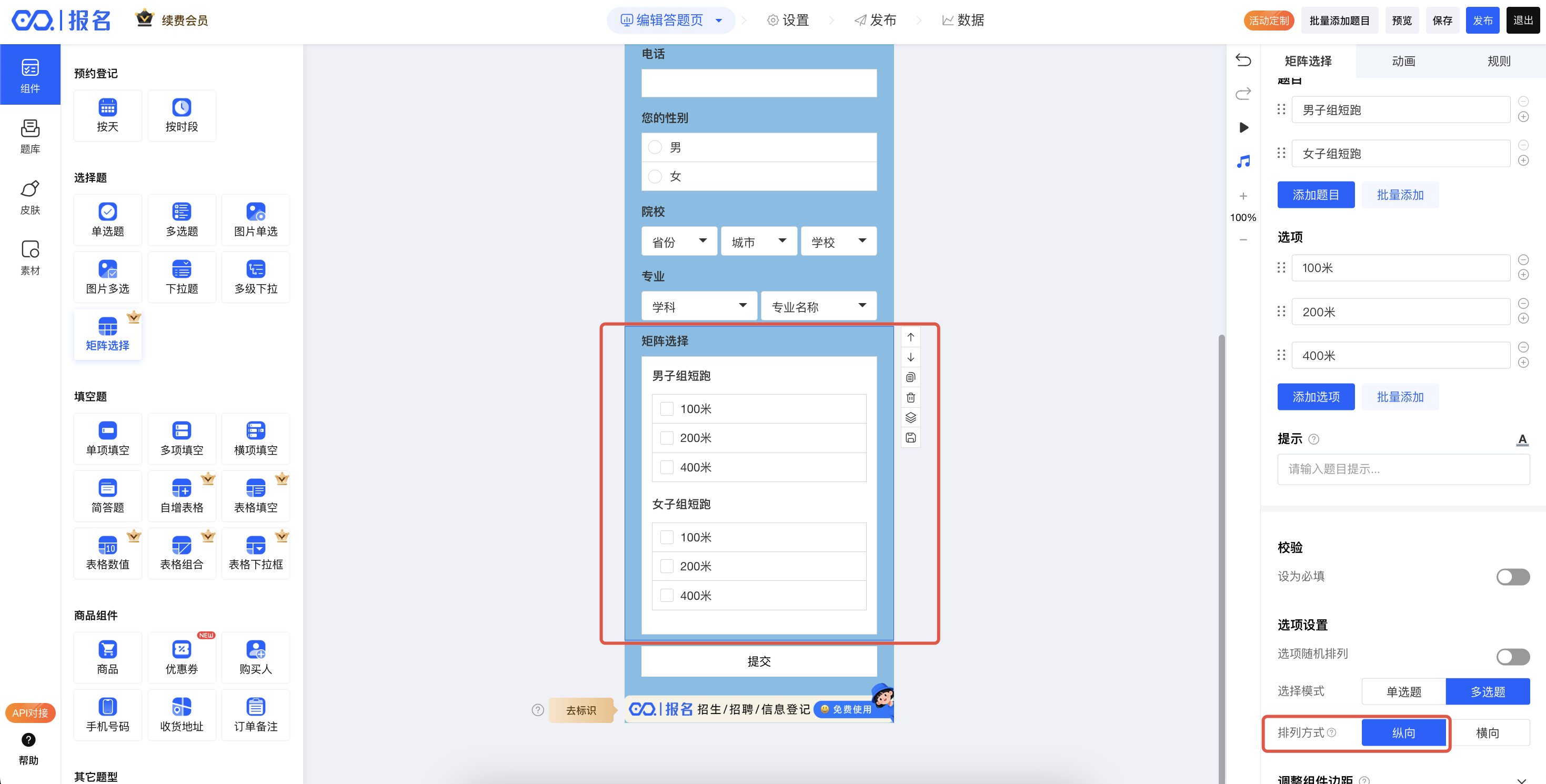 进入表单编辑器--组件--选择题--矩阵选择,点击即可添加到作品中。