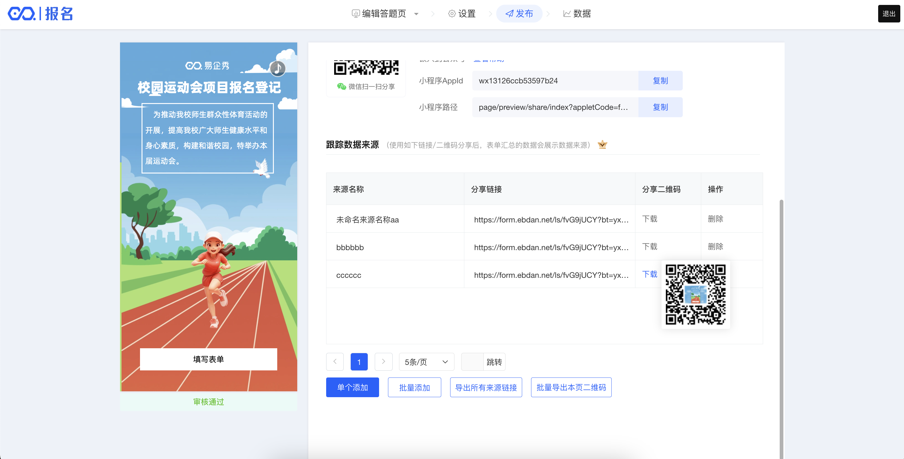在发布时,我们还可以添加多个分享渠道,实现跟踪数据来源,便于多渠道分发及对应的数据统计。