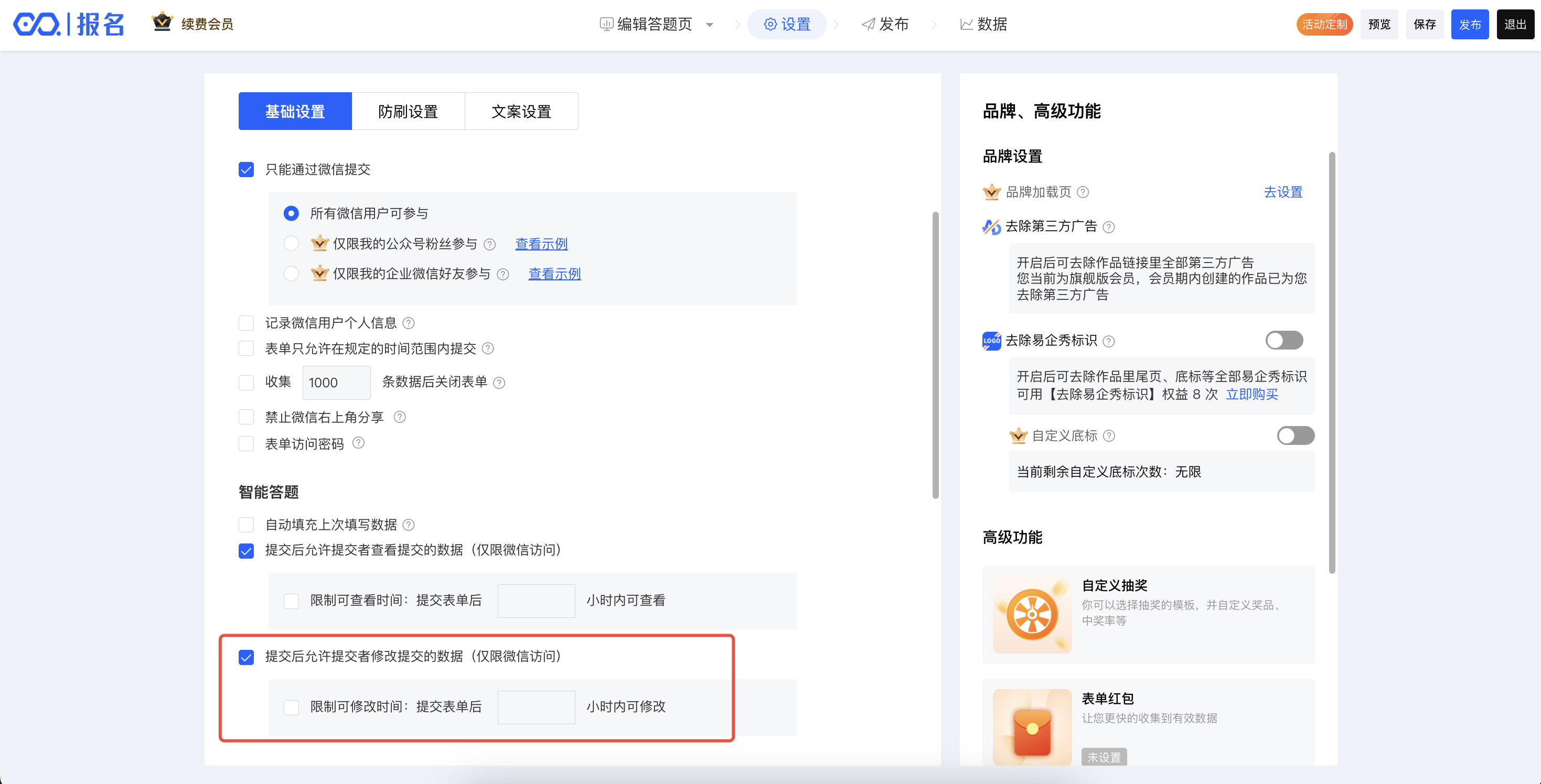 进入编辑器--设置,勾选上“提交后允许提交者修改最近一次提交的数据”,并根据您的需求,设置限制在提交表单后多少小时内,可进行修改。