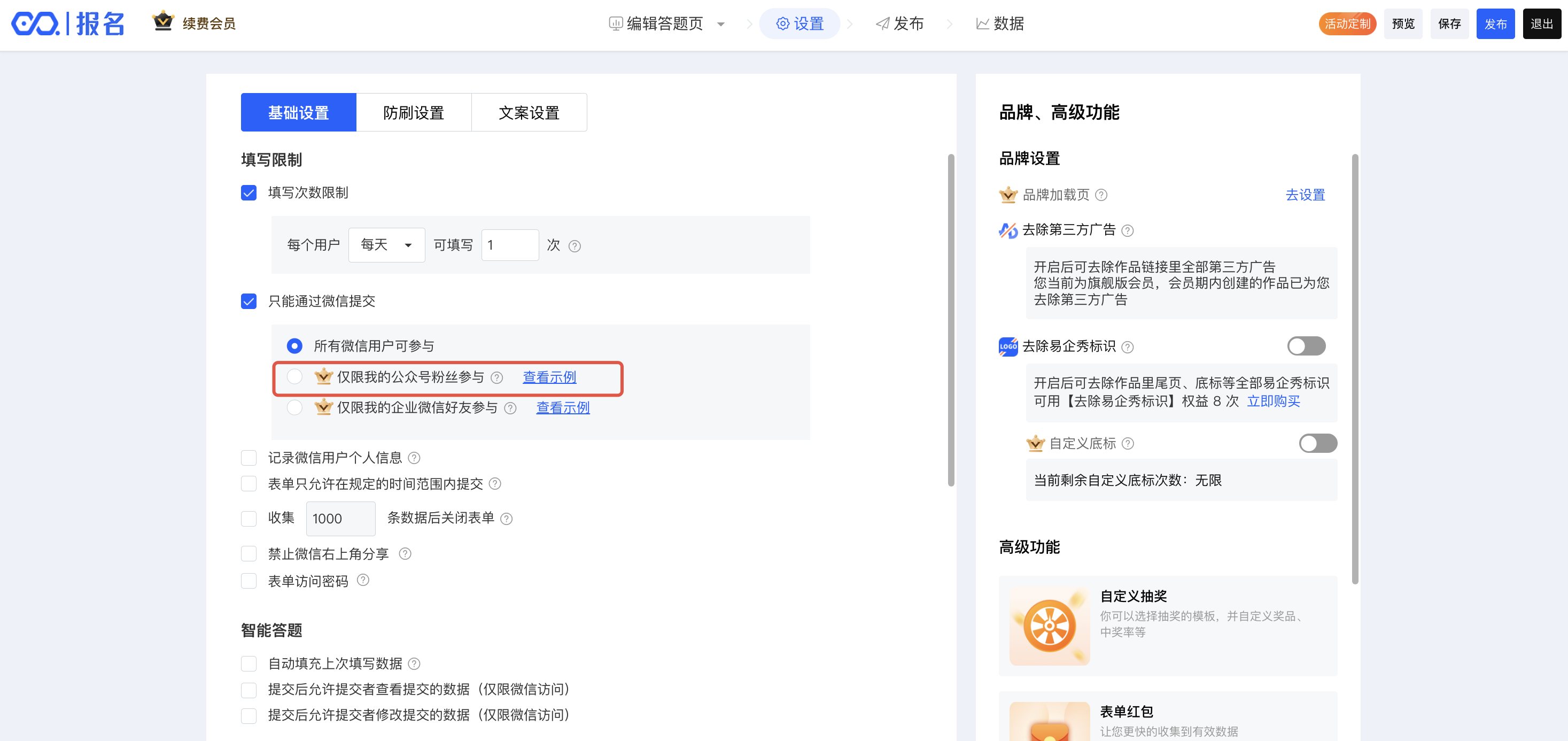 进入表单编辑器--设置中,勾选“只能通过微信提交”后,即可看到“仅限我的公众号粉丝参与”勾选项。成功开启该功能后,用户在访问作品时,就需要关注你所设置的公众号成为粉丝后,才能进入作品中。