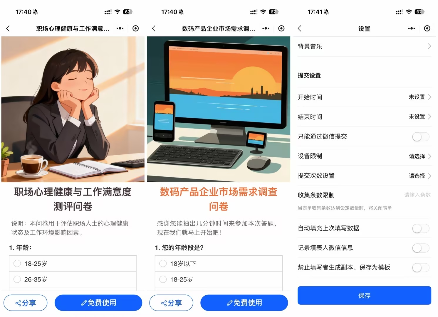 现在我做《员工心理健康关怀问卷》,会选一些色调温暖、带插画的长页风格;做《技术部内训需求调研》,就选极简硬朗的科技风。员工私下跟我说:“姐,现在咱们公司的问卷点开像在看小红书,填起来心情都好多了。”