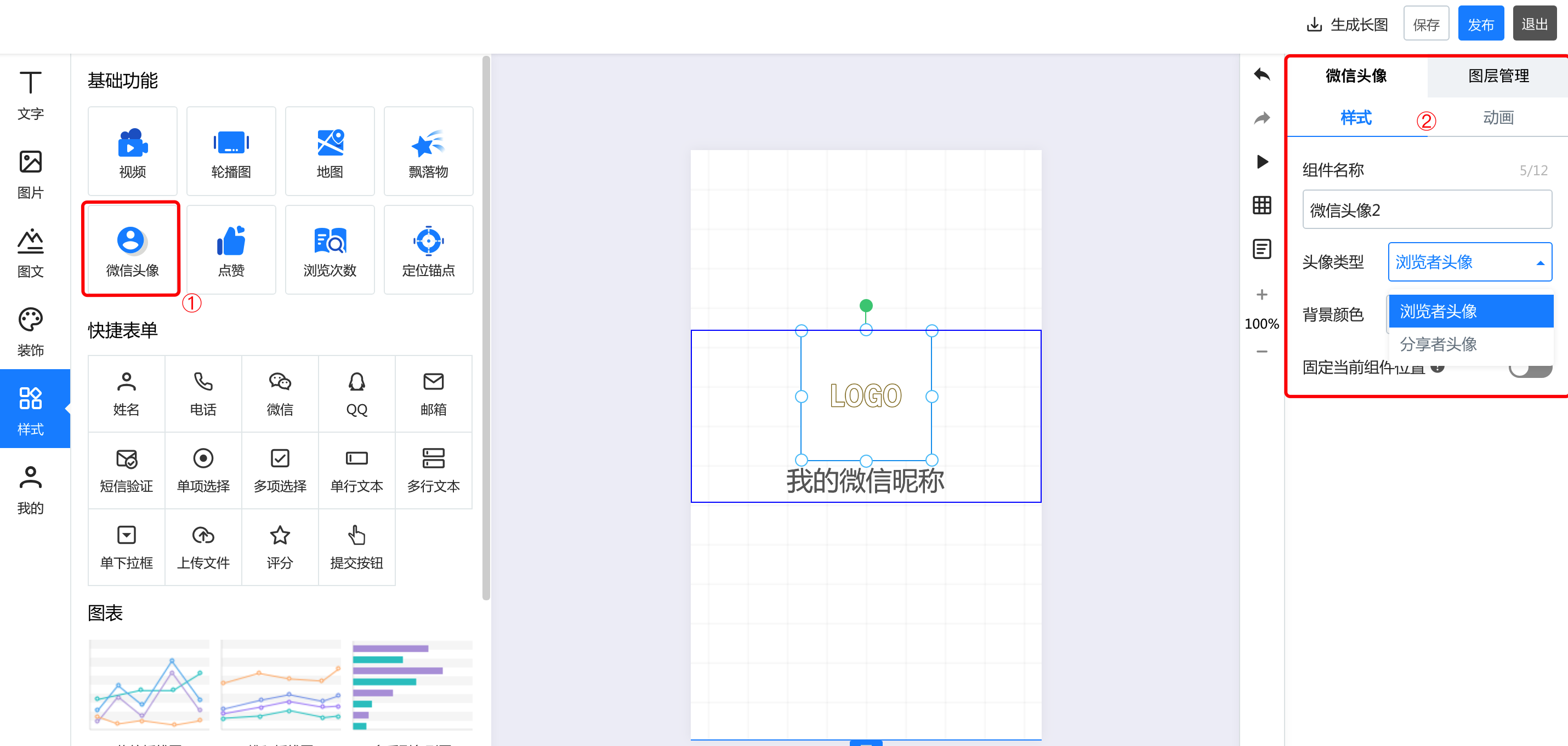 一.基础功能 1.视频 点击视频,上传本地视频,即可在长页中插入视频  2.轮播图 点击轮播图按钮,添加轮播图后,可以在右侧的轮播图中修改样式和动画。其中,有四种轮播风格,支持最多20张图片轮播,可以针对每张图进行裁剪更换和跳转链接设置  3.地图 点击添加地图后,右侧的编辑区可以针对地图样式、名称、地址等进行修改和编辑  4.飘落物 点击飘落物按钮,再右侧选择飘落物样式,即可添加飘落物动效   5.微信头像 点击添加微信头像后,可以在右侧的编辑区修改头像类型、背景颜色等信息  6.点击点赞按钮,在右侧可以选择点赞的图标样式:心、花、点赞、红旗 也可以对图标的颜色、基数等信息进行修改  7.浏览次数 点击浏览次数按钮可添加,在右侧可以针对浏览次数的样式和动画进行修改  8.定位锚点 点击定位锚点后添加,中间编辑区上下拖动锚点来修改锚点的位置,在右侧修改锚点  二、快捷表单 选中左侧的表单元素后添加成功,可以在右侧的编辑区针对名称、默认文本登记本信息以及表单的颜色等基本样式及图层进行修改  三、图表 1.添加图表  2.修改图表样式和动画 可以修改标题的文字及大小和颜色、也可以修改坐标轴及图例的颜色  3.编辑数据 可以直接在线编辑和修改数据,也可以通过导入excel表格导入数据  4.图层管理 如果作品中的元素比较多,可以通过图层管理操作,点击小眼睛隐藏或者展示,点击小锁代表不可编辑或者可编辑状态