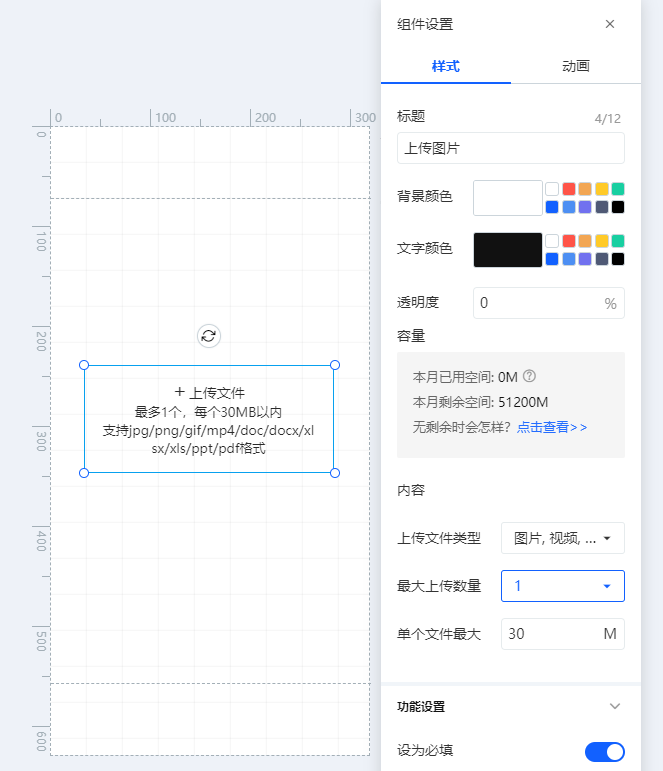 点击组件后可以对该组件进行编辑设置。支持上传的文件格式包括:图片、视频、Word、Excel、PPT、PDF;可限制每次上传的文件数量,最低1个最高10个;可限制每个文件的大小,最高300M。