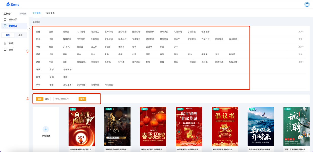 2.点击“创建作品”→选择H5编辑器→选择用途行业分类挑选模板→或在搜索框内直接搜索选择想要的模板。