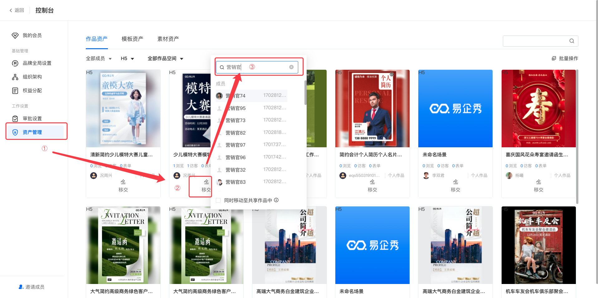 登陆控制台-资产管理-筛选成员作品/作品类型-批量操作-全选-移交-选择接收人-确认移交,