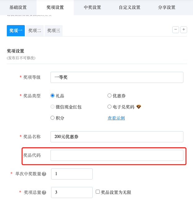 > 实现中台与企业自有奖品库打通。支持奖品代码、电子兑奖码两种对接方式。 ## 奖品代码集成第三方系统 ### 功能效果 集成对接前,如下图,奖品码为手动输入  集成对接后,如下图,奖品码选择,奖品以及奖品的库存来源于合作方 点击查询按钮会实时查询合作方接口,获取奖品信息  ### 配置接口 【应用管理】-【互动编辑器】   在配置的接口地址上拼eqs_uid_open=1参数后,在请求该接口时header中会携带eqsUidOpen(当前员工的openId)。 ### 配置说明 |页面名称|使用说明| |---|---| |库名|用来区分配置| |奖品定义查询接口|接口地址| |奖项设置成功信息通知接口|用来通知某个奖项最后设置的数量| |对接奖品类型|可选择多个,分别在奖项选择时对应类型时,才会出现选择奖品| |是否开启|开启:配置生效,关闭:配置不生效| ### 接口规范 - 奖品定义查询接口 - 方法类型:POST - Content-Type:application/json - 接口入参 | 参数名 | 是否必须 | 参数类型 | 参数说明 | | --- | --- | --- | --- | | nonce | 是 | String | 随机字符串 | | timestamp | 是 | Long | 当前 UNIX 时间戳,可记录发起 API 请求的时间。例如1529223702 | | signature | 是 | String | 请求签名。 | | msgEncrypt | 是 | String | 数据明细,不同业务类型,数据格式不一样 | - msgEncrypt解密数据格式 | 参数名 | 是否必须 | 参数类型 | 参数说明 | | --- | --- | --- | --- | |corpOpenId|否|String|平台使用,子企业唯一标识| |prizeName|否|String|奖品模版名称,可模糊查询| |prizeCode|否|String|奖品模版代码,可模糊查询| |prizeType|是|int|奖品类型[0、礼品 1、优惠券 4、积分]| |creationId|否|long|作品ID| |pageSize|否|int|每页大小,默认20| |pageNo|否|int|第几页,默认1| - 接口返回值 | 参数名 | 是否必须 | 参数类型 | 参数说明 | | --- | --- | --- | --- | |code|是|String|状态码,200请求正确,其他视为失败| |msg|否|String|返回消息| |list|是|List|prizeName奖品名称<br>prizeCode 奖品代码",<br>surplus 剩余库存数(不返回该字段或者返回值为-1时表示无限库存)<br>prizeImgUrl 奖品图片链接 没有可不传<br>redemptionMethod: 兑奖方式 <br> linkType:链接类型<br>redemptionAddr: 跳转地址| |map|是|Map|count列表查询总条数| 至少包含code和msg参数。 ```json { "code": 200, "msg": "操作成功", "obj": {}, "map": { "pageNo": 1, "count": 1, "pageSize": 10, "end": true }, "list": [ { "prizeName": "奖品名称", "prizeCode": "奖品代码", "surplus": 1, // 剩余库存数, "prizeImgUrl": "https://wework.qpic.cn/wwhead/nMl9sso", "redemptionMethod": "webClaim" // 可选值webClaim: 网页兑奖,outClaim: 外部兑奖 "linkType": "webAddress" // 可选值webAddress: 网页地址,miniProNormalAdr: 小程序普通地址, miniProTabAdr: 小程序tabbar地址 "redemptionAddr": '' //跳转地址 } ] } ``` - 奖项设置成功信息通知接口 - 方法类型:POST - Content-Type:application/json - 接口入参 | 参数名 | 是否必须 | 参数类型 | 参数说明 | | --- | --- | --- | --- | | nonce | 是 | String | 随机字符串 | | timestamp | 是 | Long | 当前 UNIX 时间戳,可记录发起 API 请求的时间。例如1529223702 | | signature | 是 | String | 请求签名。 | | msgEncrypt | 是 | String | 数据明细,不同业务类型,数据格式不一样 | - msgEncrypt解密数据格式 | 参数名 | 是否必须 | 参数类型 | 参数说明 | | --- | --- | --- | --- | |prizes|是|list|奖品信息| |prizes.prizeCode|是|String|奖品代码| |prizes.prizeName|是|String|奖品名称| |prizes.prizeNum|是|int|奖品使用数量| |id|是|String|作品id| |time|是|String|使用时间| ```json { "prizes": "[{\"prizeCode\":\"prize13\",\"prizeName\":\"测试13\",\"prizeNum\":3}]", "id": "234", "time": "2024-03-06 13:50:23" } ``` ## 奖品代码人为填写 创建互动H5在设置奖项时,选择奖品或优惠券,并填写奖品代码。如下图: 奖品代码为企业奖品库的一类奖品标识,访客在中奖后,可通过此代码领取对应的奖品(会有事件推送,见下文) 此方式,奖品代码对应的奖品一般是同一种奖品。  ## 数据推送 访客用于在抽奖中奖后,中台会将访客的中奖信息进行推送,企业需要设置数据接收的地址。 数据接收地址设置方式见“[数据回传](https://hc.eqxiu.cn/doc/24/)”。 数据推送对接方式见“[数据推送](https://hc.eqxiu.cn/doc/24/)” 访客中奖数据推送格式见“[活动中奖](https://hc.eqxiu.cn/doc/52/)”