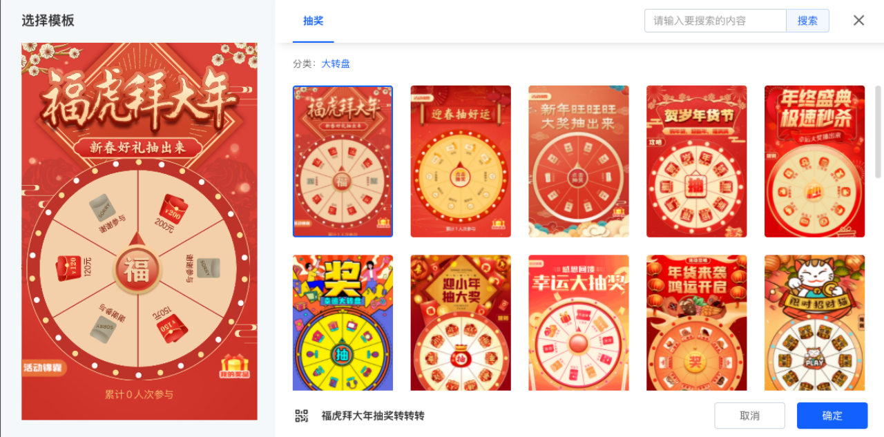抽奖组件位于【智能组件】-【抽奖】,点击【抽奖】即可打开抽奖组件添加面板,选择抽奖模版后,点击添加该模版,则在画布中增加该抽奖,然后进入编辑面板中编辑。