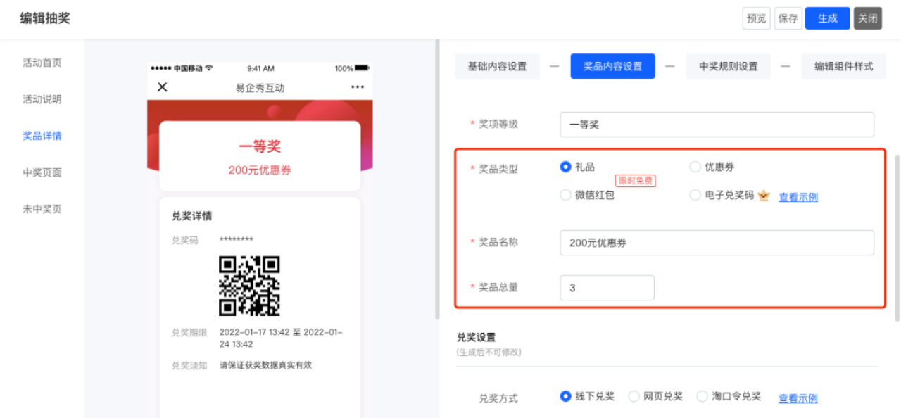可以增加和删除奖项,下方进行奖项设置,可以设计奖项等级和奖品类型。如果设置为礼品,则可以设置名称和数量。