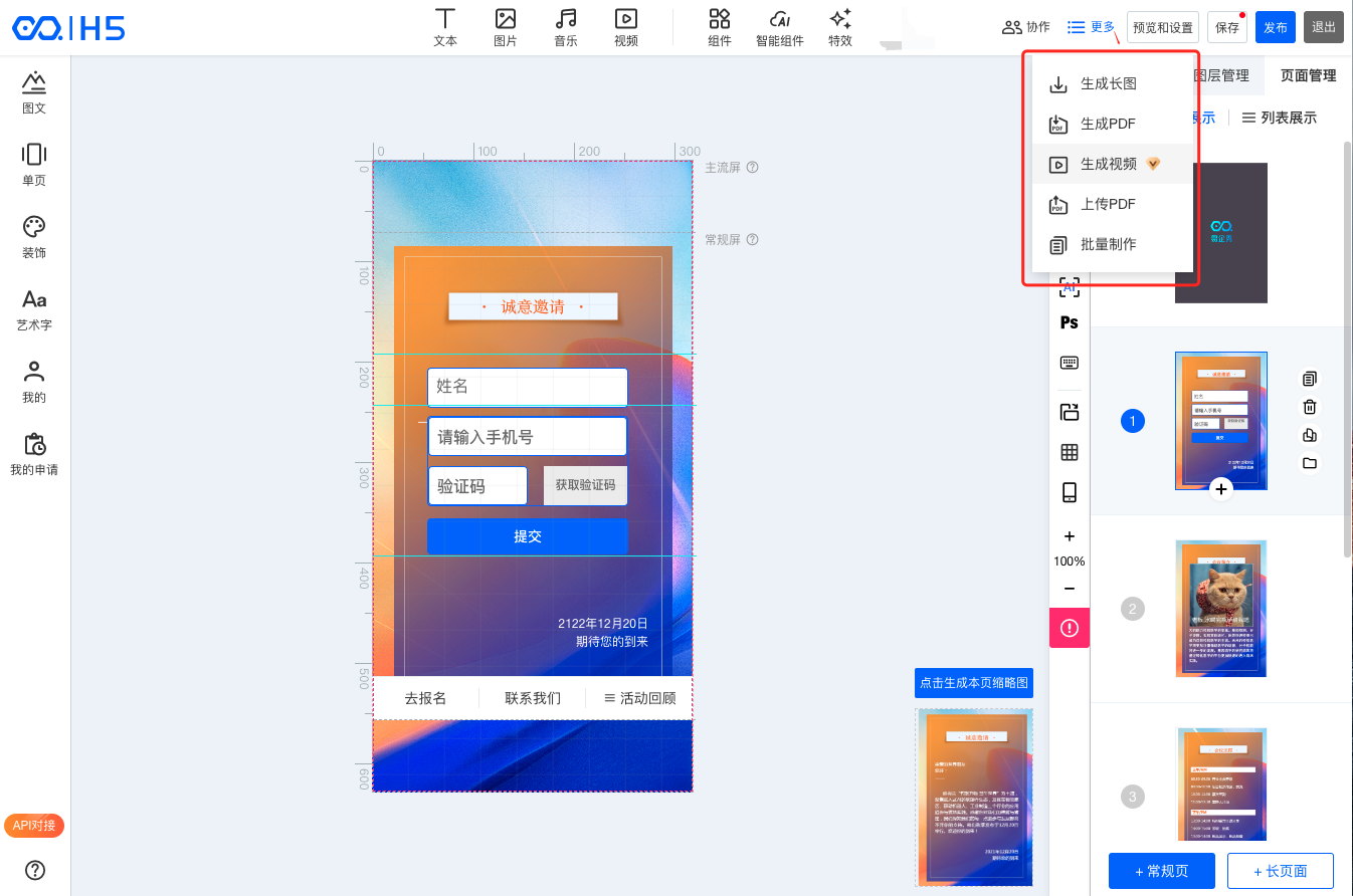 右上角鼠标悬浮在发布按钮上,支持生成视频、PDF、长图