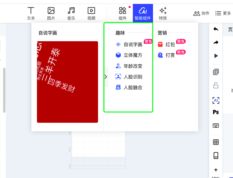 高级功能范围「自说字画、立体魔方、年龄改变、人脸识别、人脸融合、拼图、轮播图、数据图表、随机事件、快闪、一镜到底、画中画、红包、打赏、短信验证」。