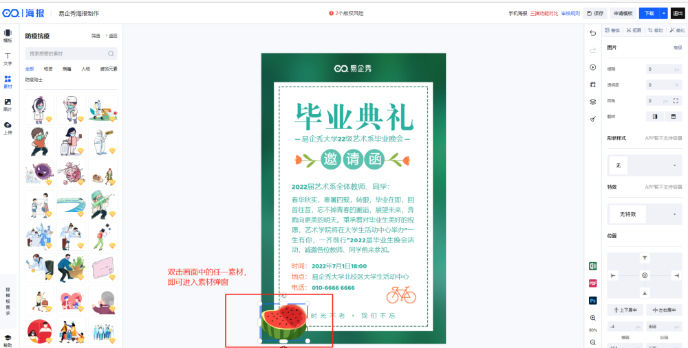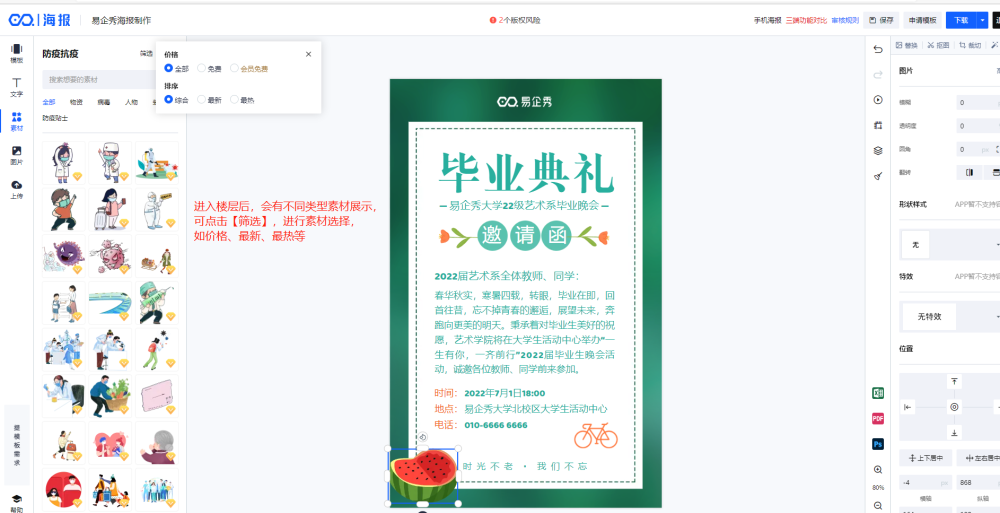 要求模板画面内容中所有元素必须使用易企秀编辑器【素材】、【图片】区域内容,秀客自行上传素材,将视为版权风险素材进行驳回。