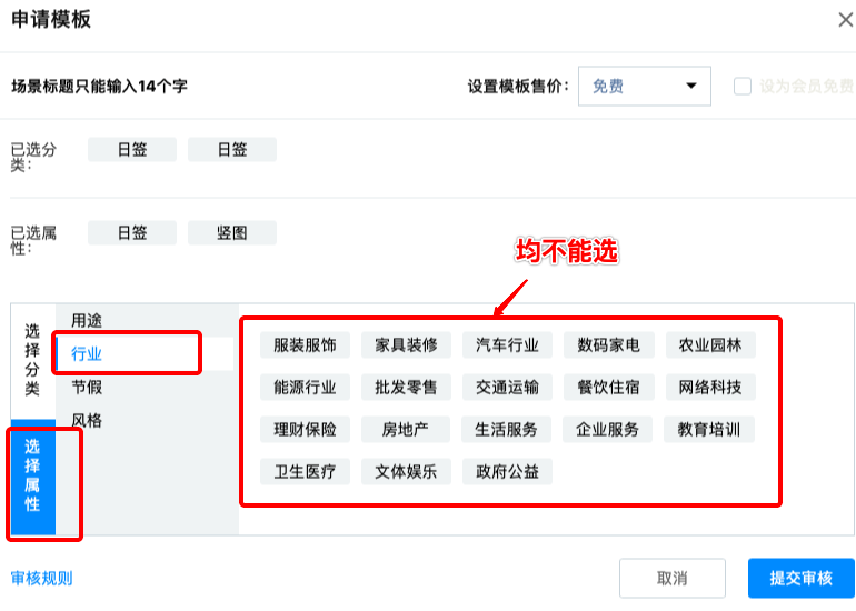 6、日签模板属性均不能勾选任何行业标签,如下图所示