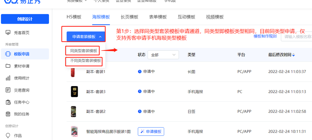 第一步:在海报编辑器点击申请模板后,进入模板申请-海报模板,点击申请套装模板,选择同类型套装模板,需注意连张套图仅可选择同类型套装模板申请入口,否则不能完成提交审核申请操作。