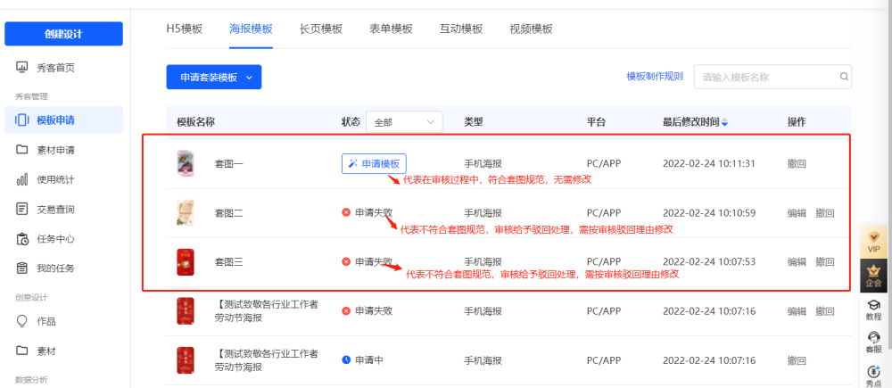 1、一套模板种如有不符合审核规范的情况,将驳回不符合规范的模板,符合要求模板为未申请状态,此时,秀客需修改不符合规范(即申请面板显示驳回)的模板,重新提交一套模板的审核申请,如下图所示: