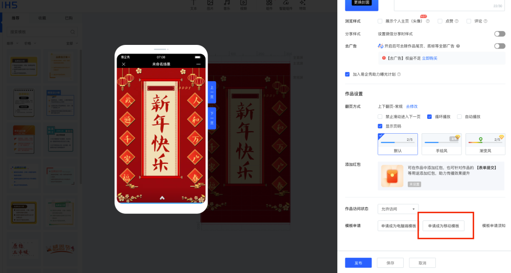④再次进入编辑,点击右上角【预览和设置】-【申请成为移动端模板】↓ |