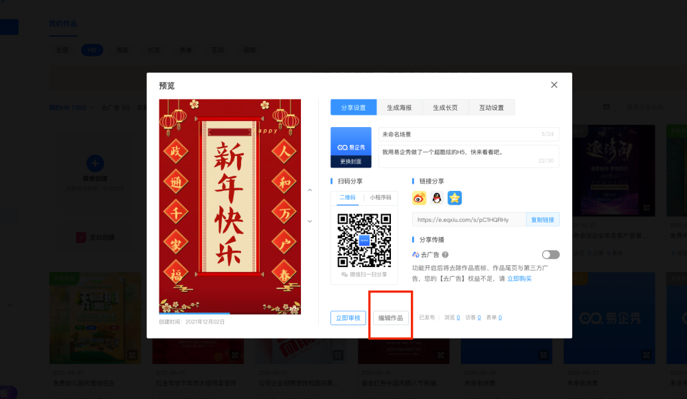 ③点击右上角【预览和设置】发布作品后选择【编辑】↓ |