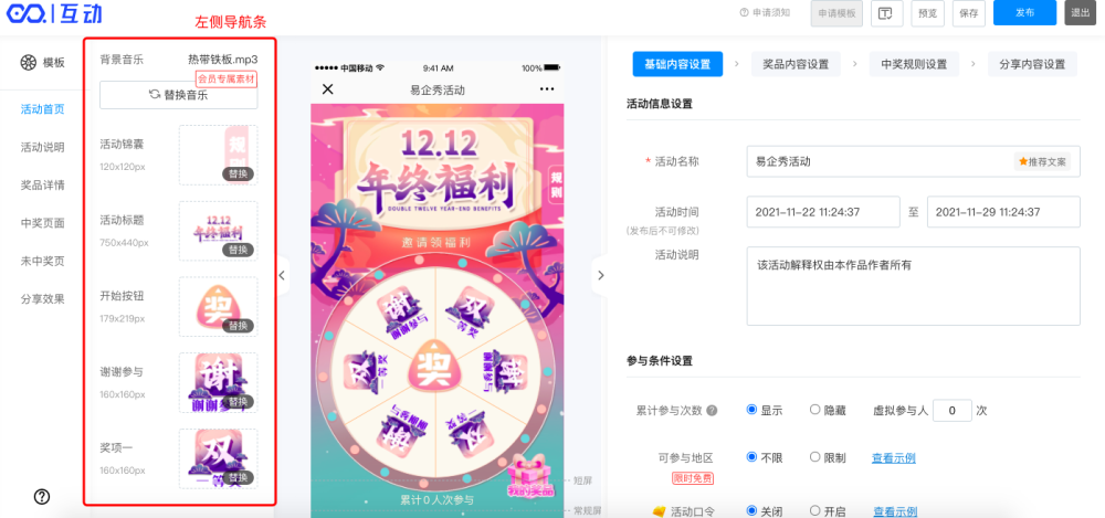 上传编辑器内容即秀客需要创作的内容,各类型需上传内容存在差异,秀客需在创作之前,了解所选择类型需上传内容,按照《分类制作规范》进行创作即可。如下图所示,标记红框为大转盘类型中,秀客需上传内容。