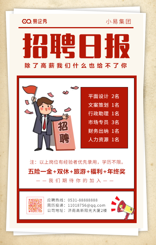 简约通常与高级、大气两个词汇做关联,简约不等于简单、空洞,如何将简约风格做到‘不简单’,背景图、及元素、排版极为关键,有层次地背景图能很好地避免单调乏味地问题,新颖有亮点地元素能做到吸人眼球,突出重点地作用。简约风格通常可用于节日热点、二十四节气、招聘、招生等,且在招聘主题种,简约风格常与卡通风结合。