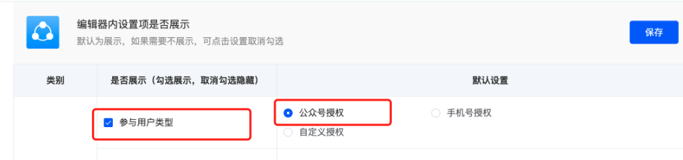 但是如果取消勾选参与用户类型,默认设置还是公众号授权的话,意味着在编辑器内不会展示参与用户类型这一行,但是发布