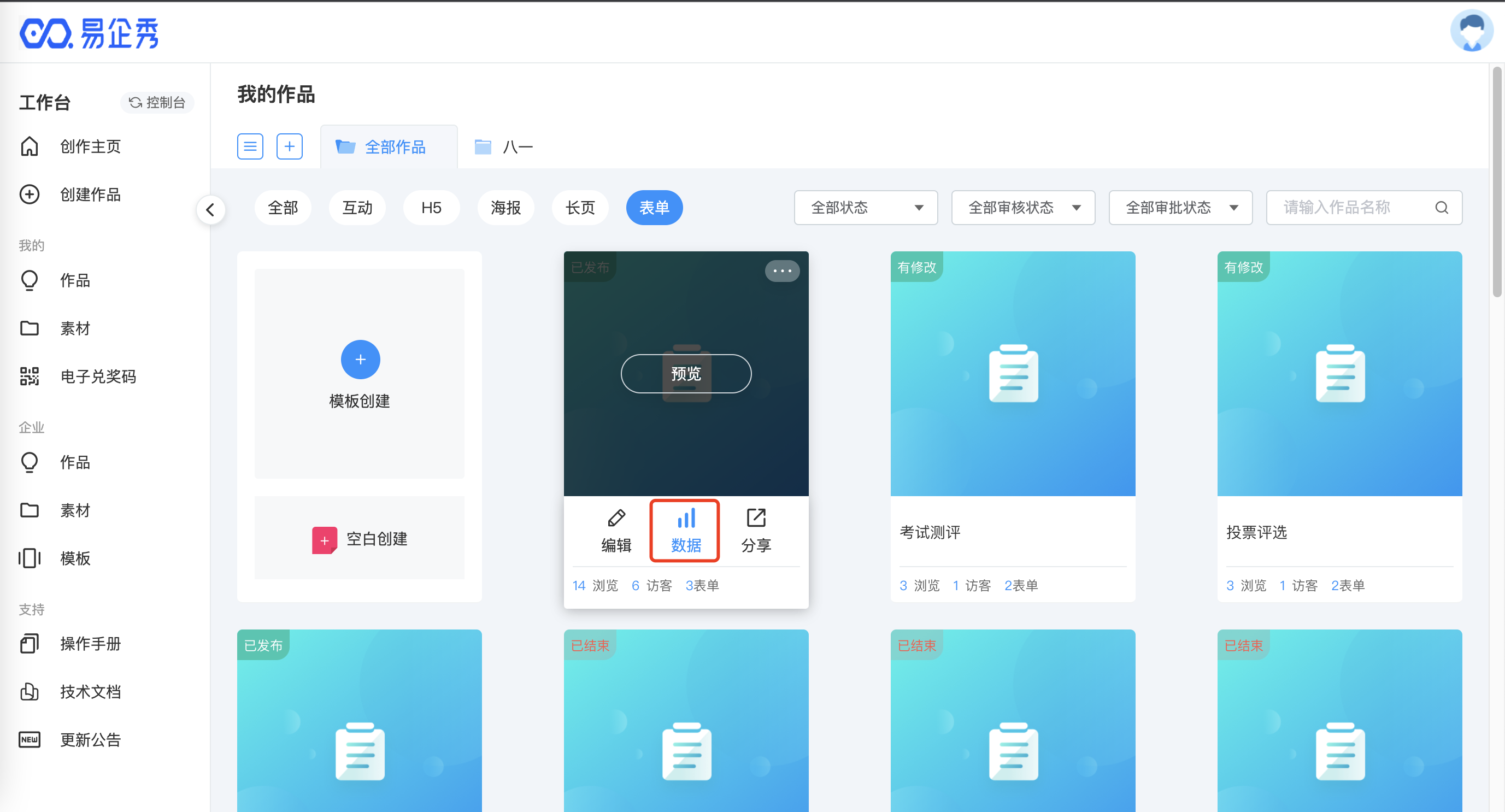 1.选择表单作品,点击数据。
